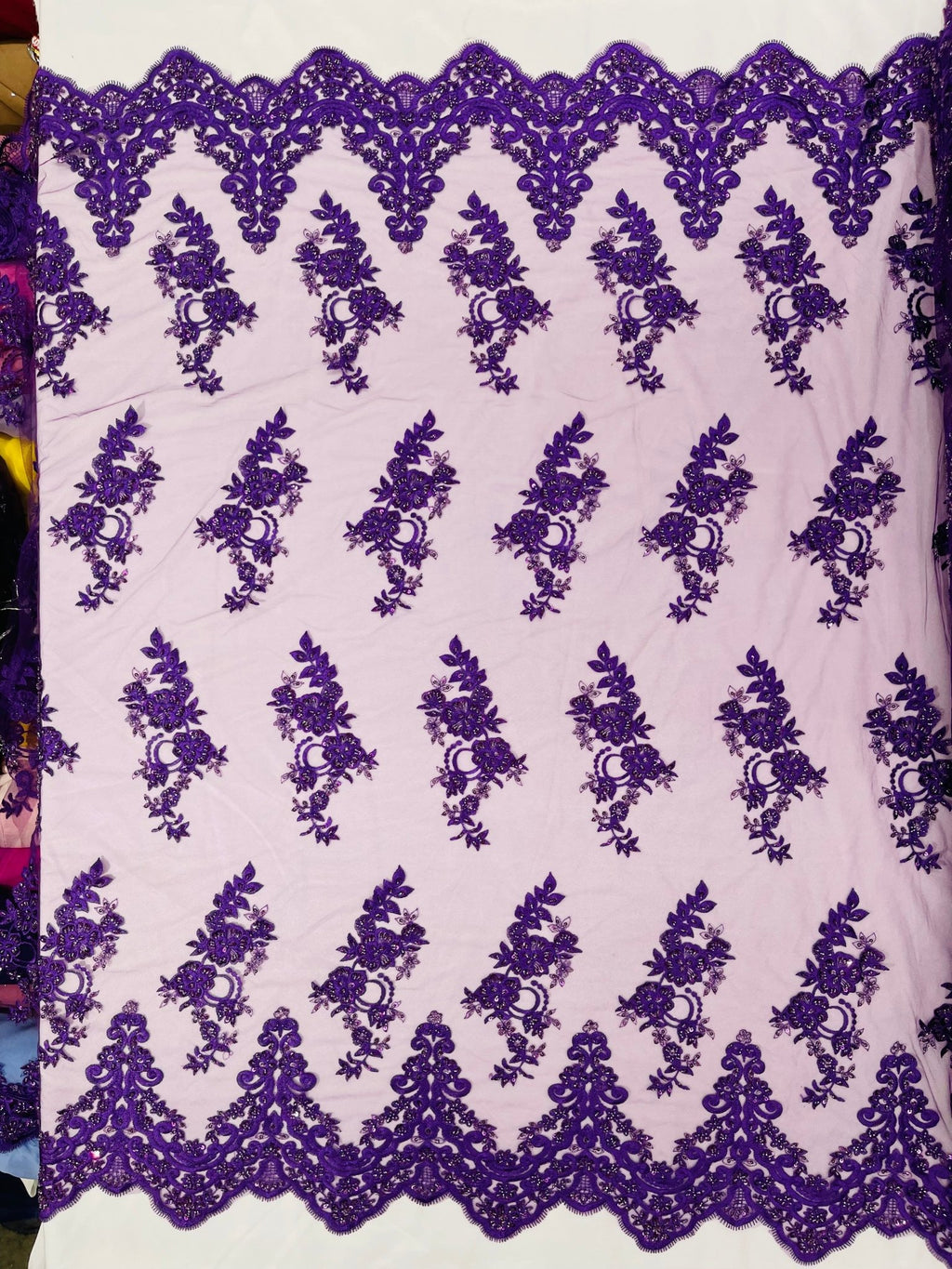 These beautiful flowers lace its hand beaded with sequins, and glass beads on a mesh. This is a high quality, heavy weight fabric that is extremely elegant and durable. This beaded fabric is hand crafted and features an array of beads that are precisely sewn together to create an elegant design on the mesh underlay. It also has beautiful scallop edges that are finished on both sides of the fabric.