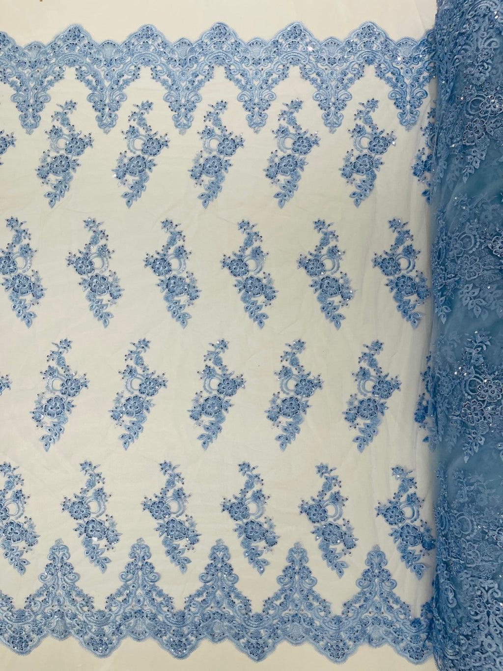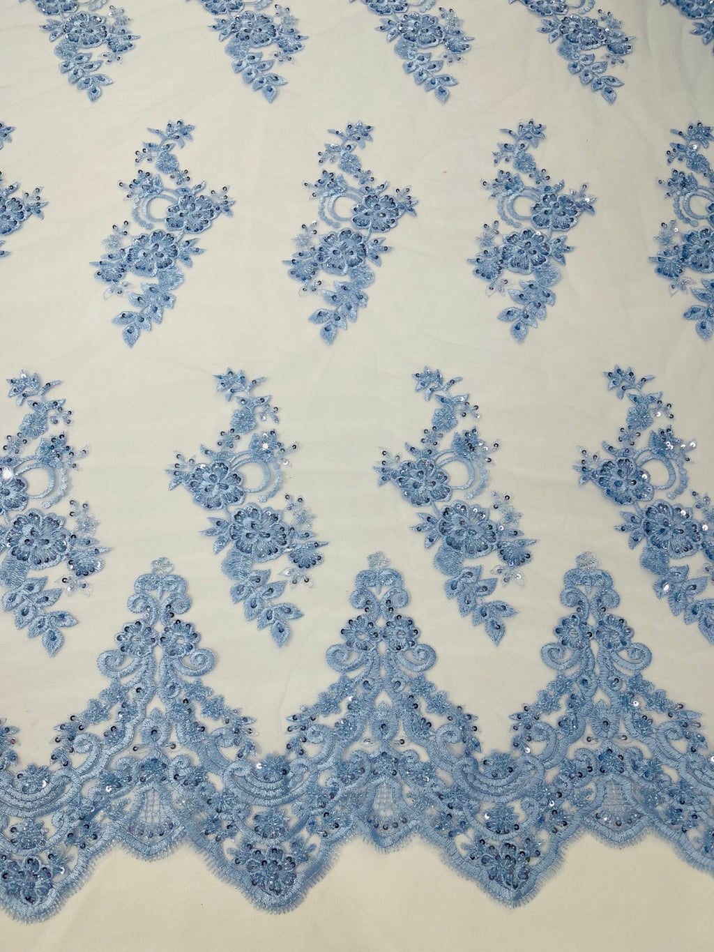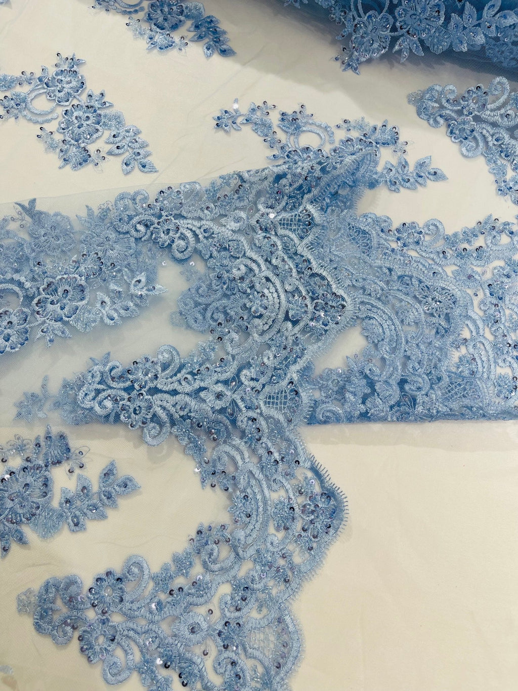 This wonderful floral lace is perfect for numerous applications, including bridal wear, evening gowns, dresses, and more. Use this fabric to design your next dress to brighten and sparkle up your next special occasion, wedding, and more. This fabric is sure to be highlight of your next outfit or event.