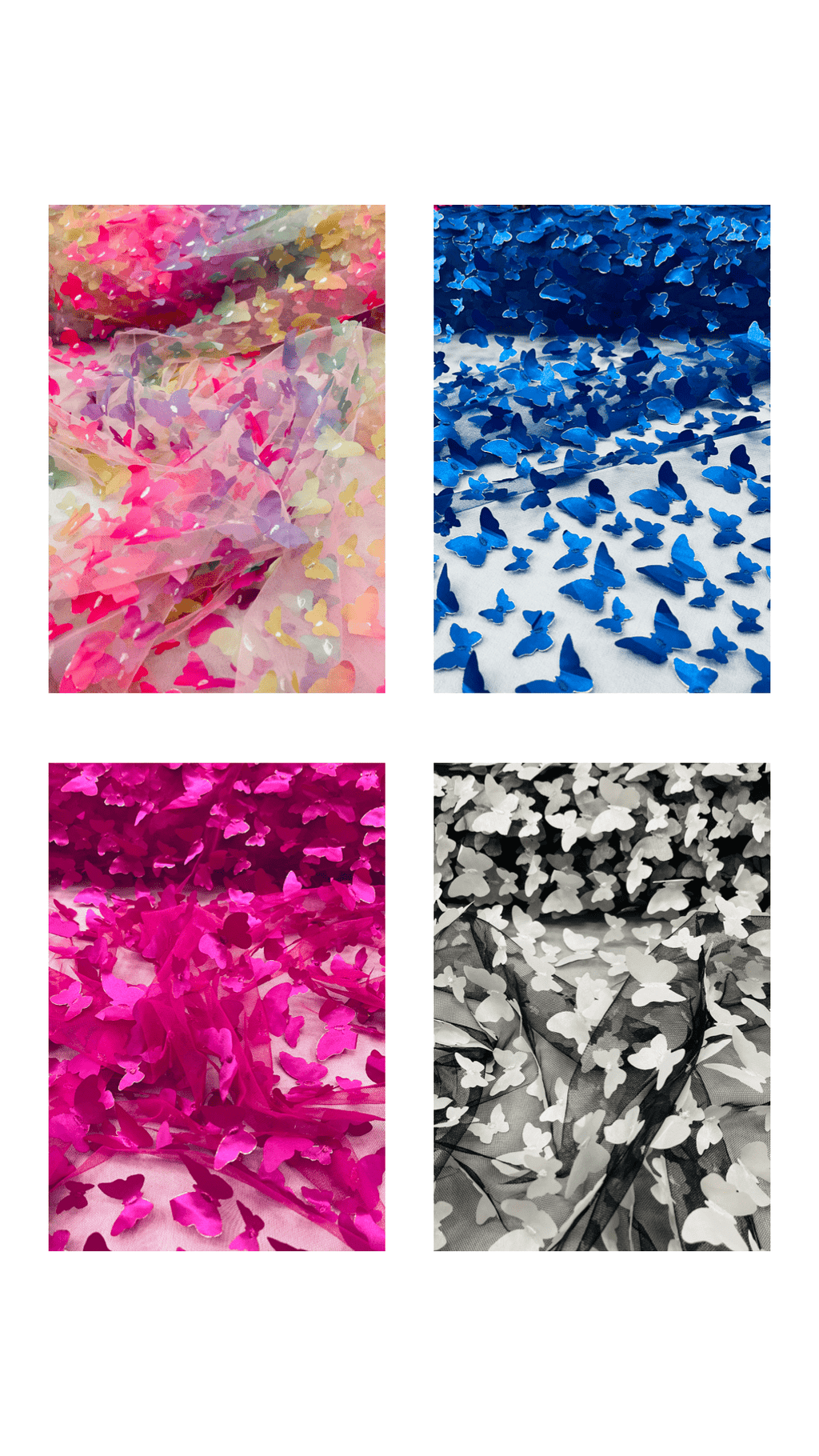 Beautiful princess flower design embroider 3d butterfly's on a mesh lace. The lace 3-D butterfly's embroider for a sparkling real look. This butterfly's lace has a 3d butterfly's on the design that gives a beautiful shine. This lace is a great item for show people and dance dresses, great for Vegas shows.