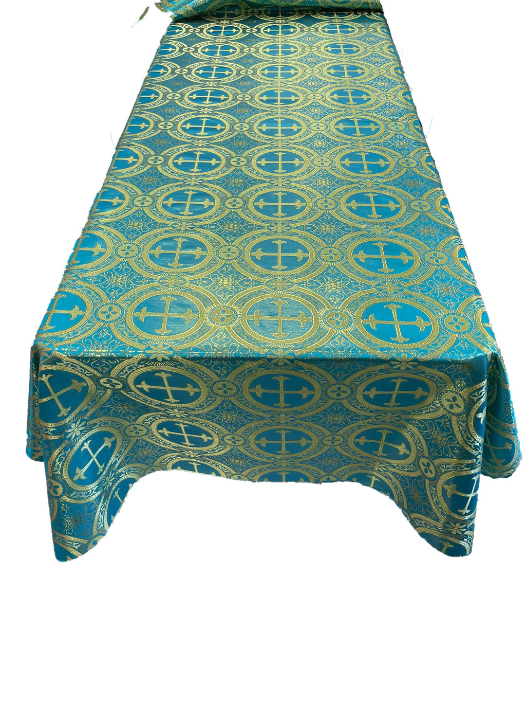 Turquoise/Gold - Rectangular Metallic Cross Brocade Jacquard Satin Tablecloth Overlay/Religious Brocade/Liturgical Fabric/Church.