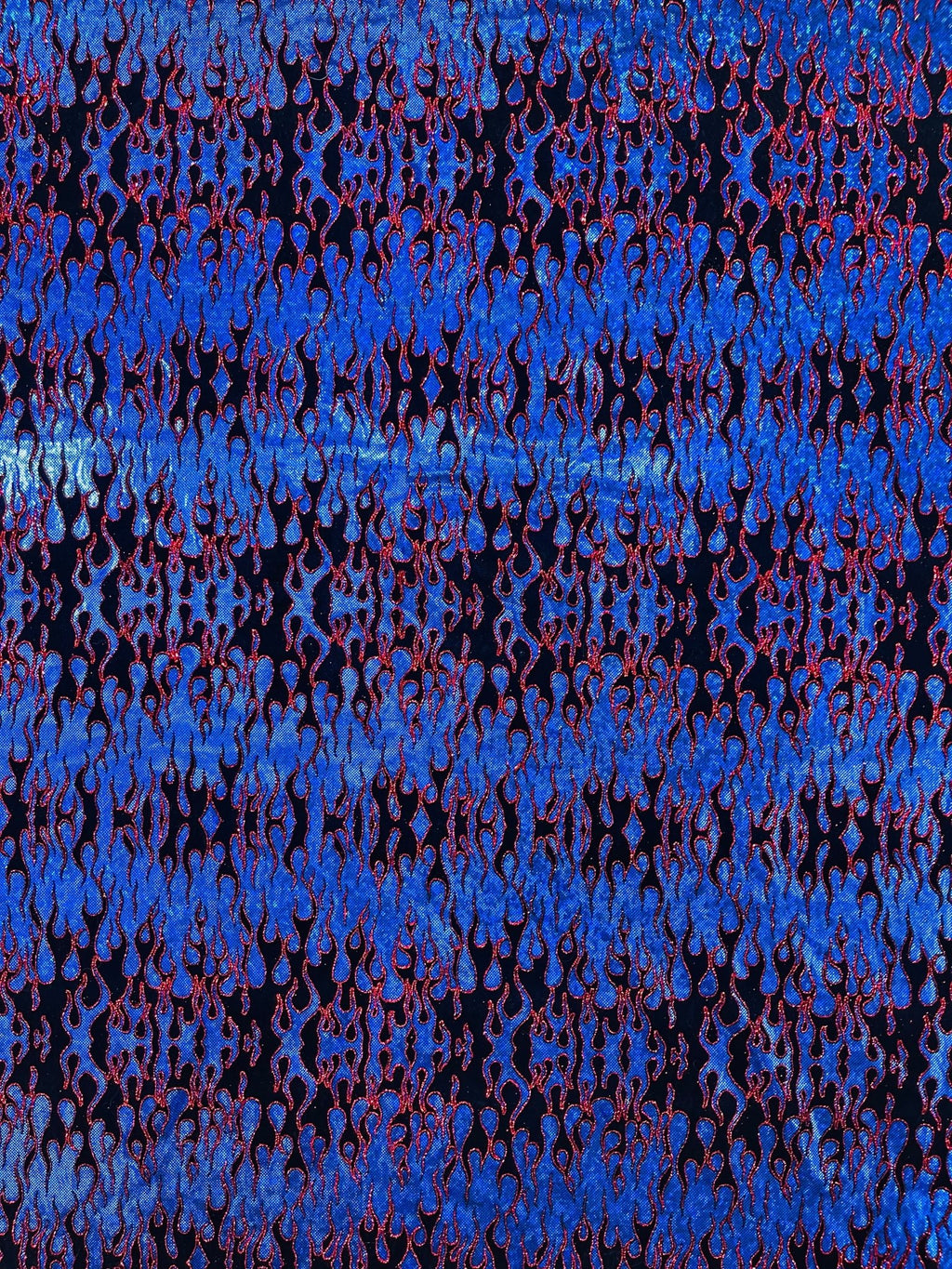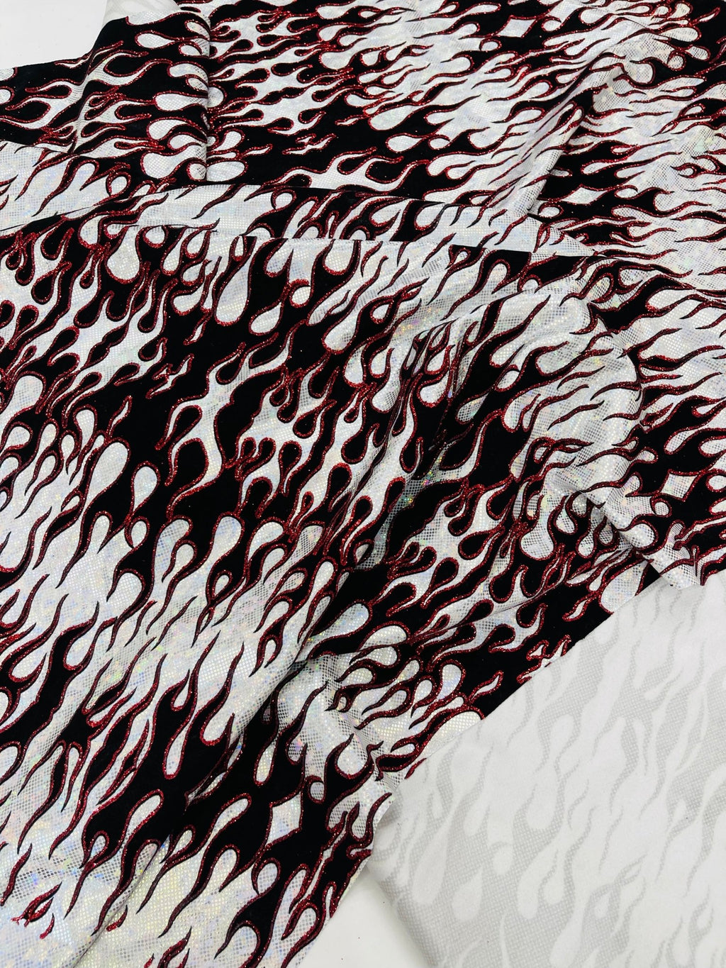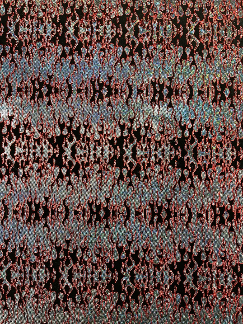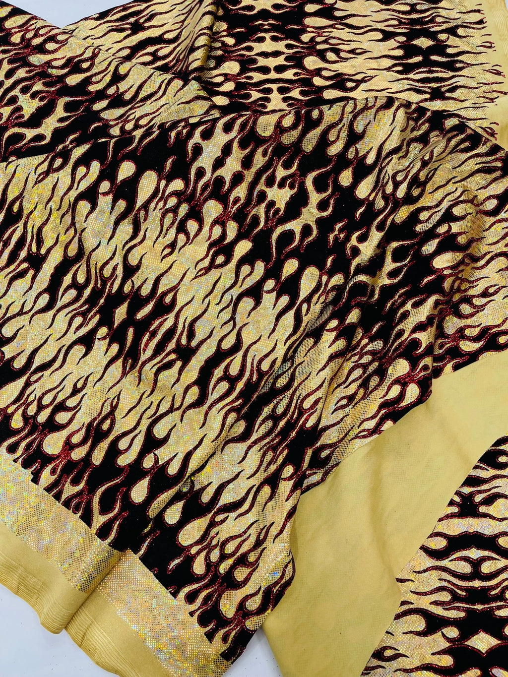 Elevate your fashion game with our holographic flames foil printed spandex fabric! This eye-catching material features a mesmerizing multi-color flames design printed on a stretchy nylon spandex base. With its 4-way stretch capabilities, this 60" wide fabric moves with you, ensuring a comfortable and flattering fit. Perfect for creating bold statement pieces like leggings, bodysuits, or swimwear, this vibrant fabric is sure to turn heads. Unleash your creativity and craft dazzling garments that sizzle with style.