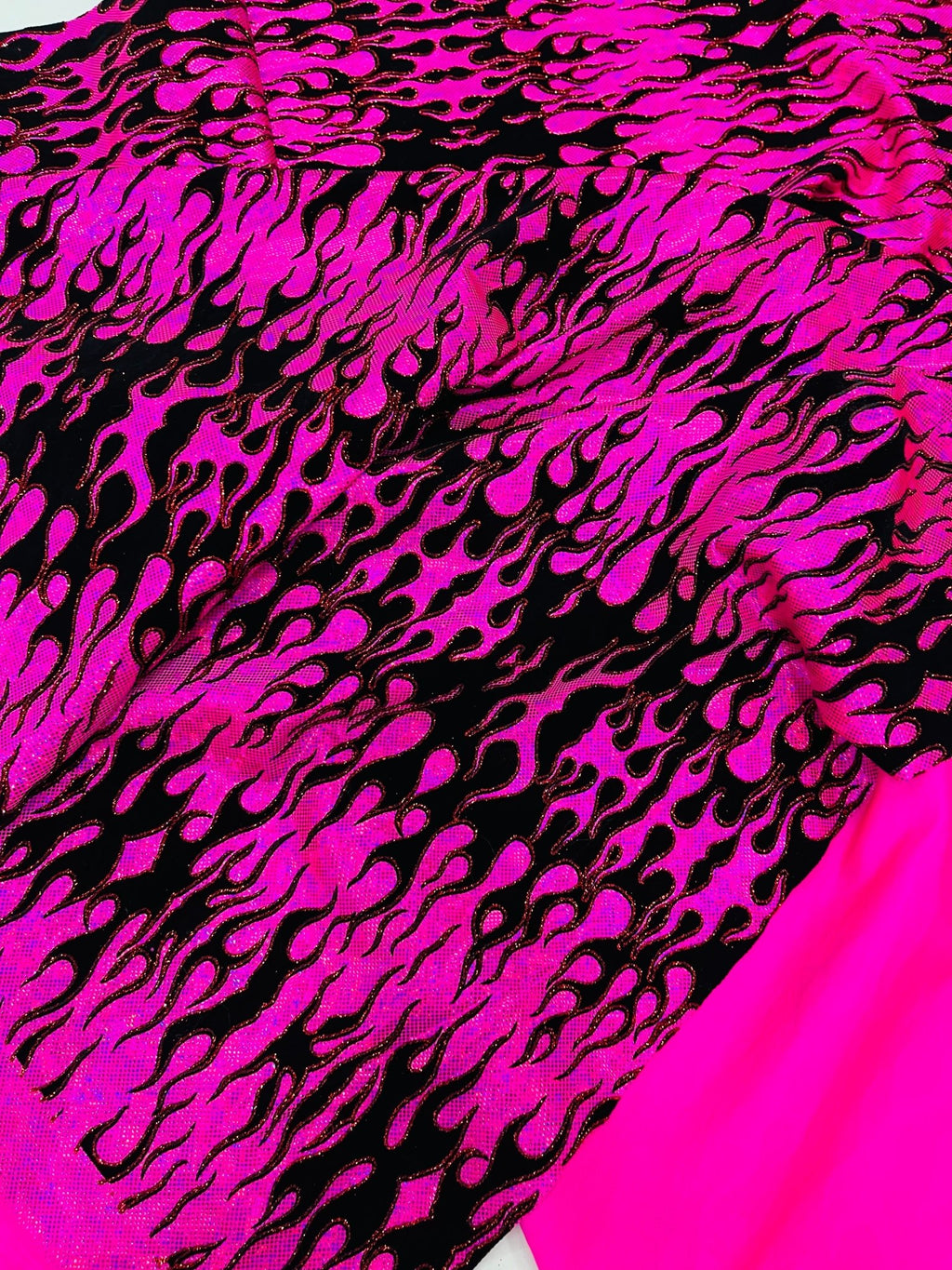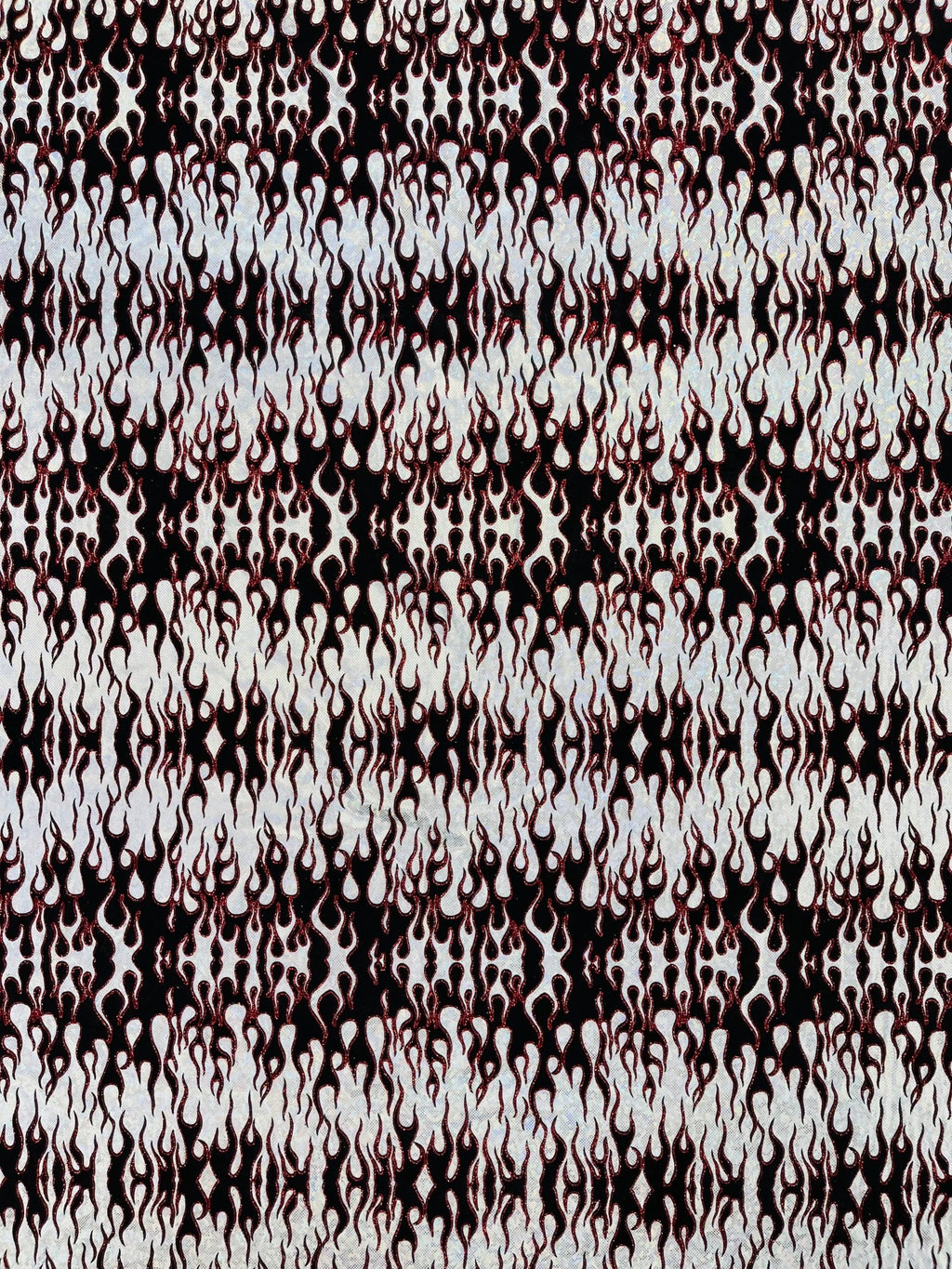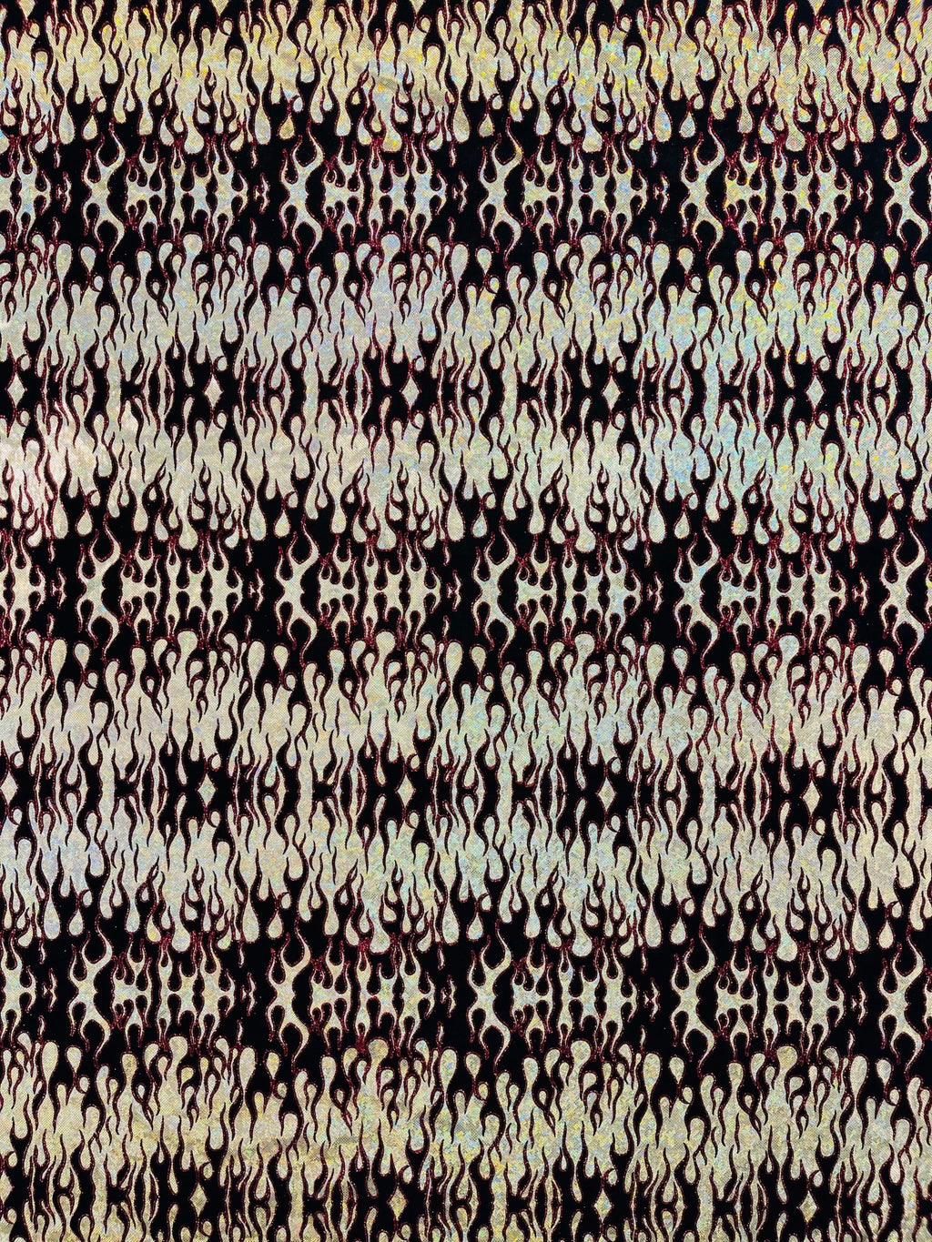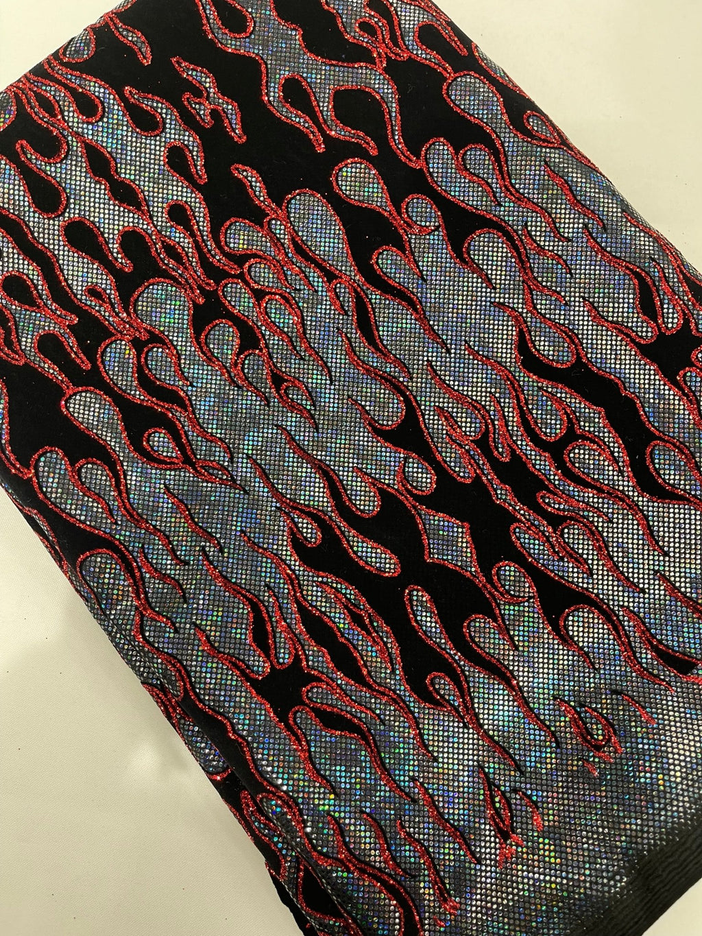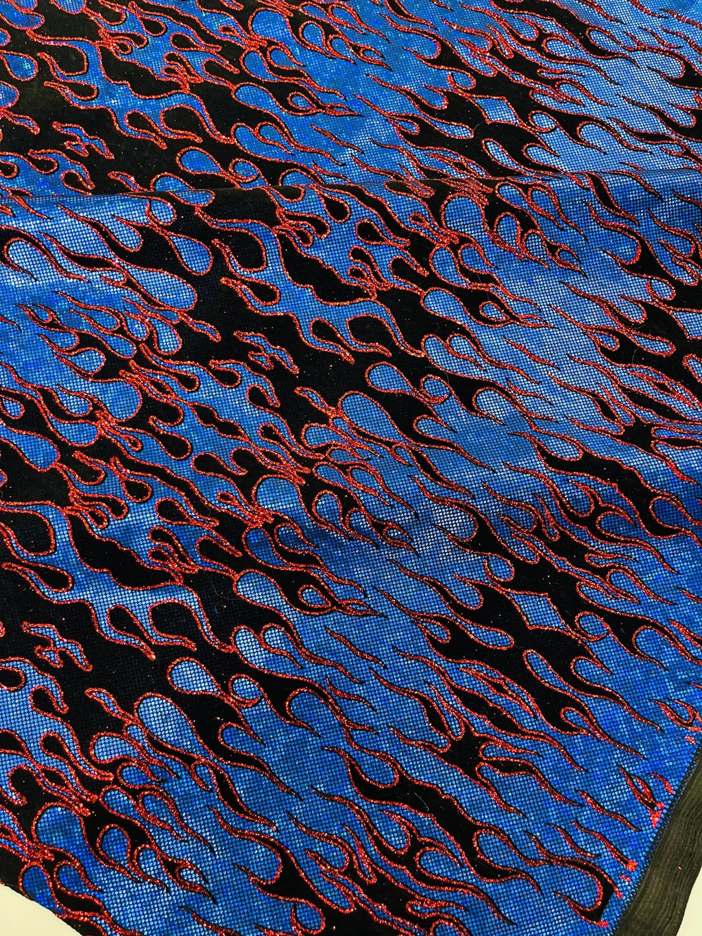 Elevate your fashion game with our holographic flames foil printed spandex fabric! This eye-catching material features a mesmerizing multi-color flames design printed on a stretchy nylon spandex base. With its 4-way stretch capabilities, this 60" wide fabric moves with you, ensuring a comfortable and flattering fit. Perfect for creating bold statement pieces like leggings, bodysuits, or swimwear, this vibrant fabric is sure to turn heads. Unleash your creativity and craft dazzling garments that sizzle with style.