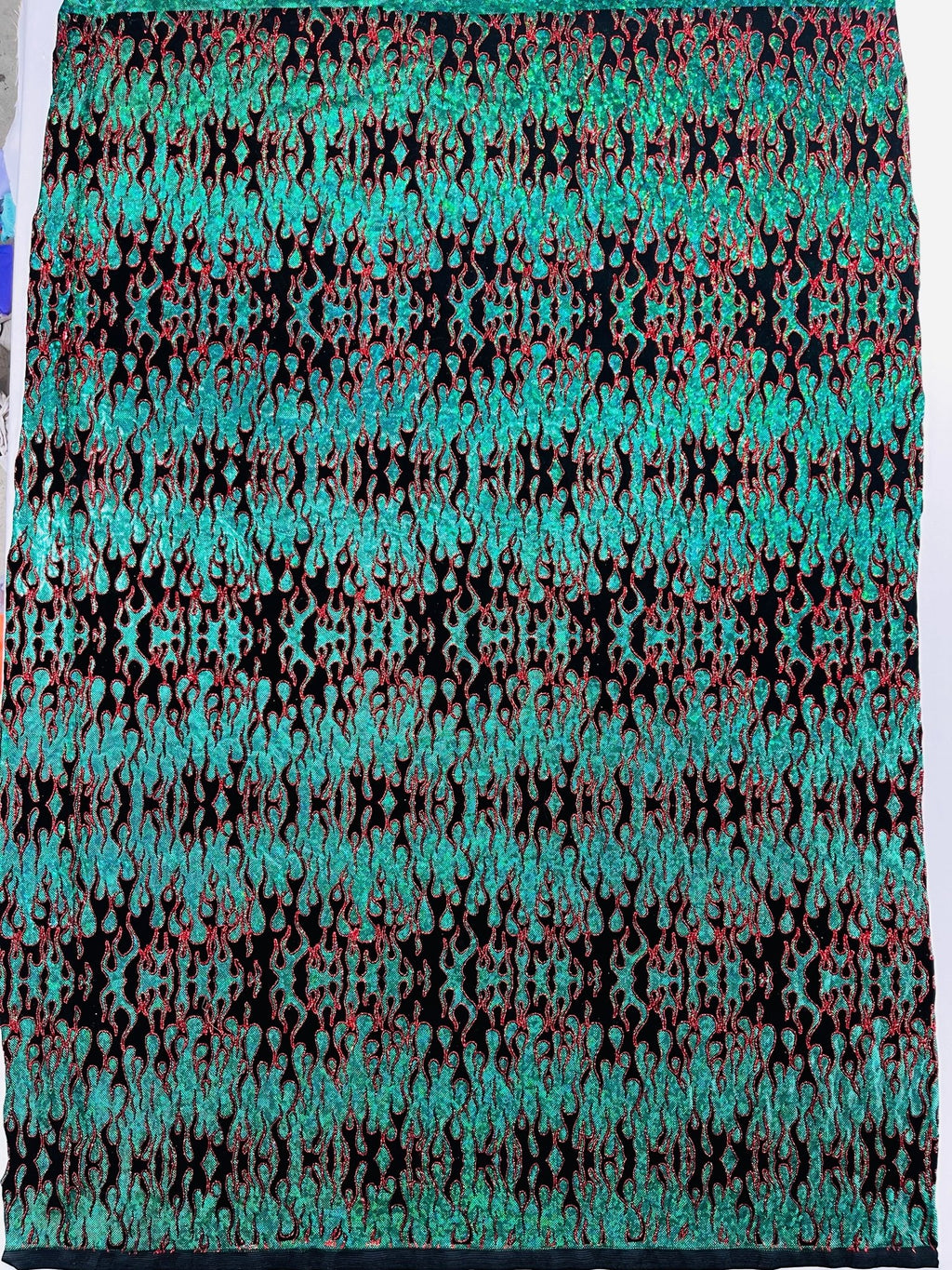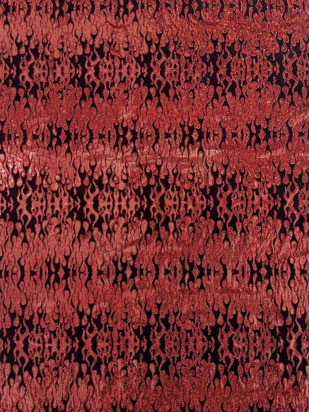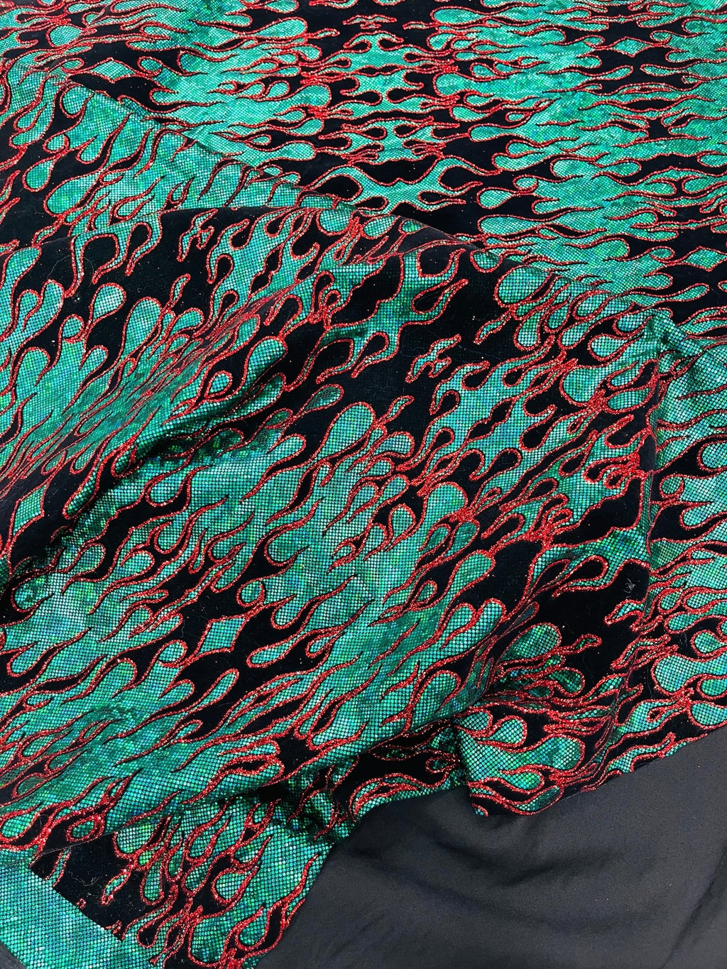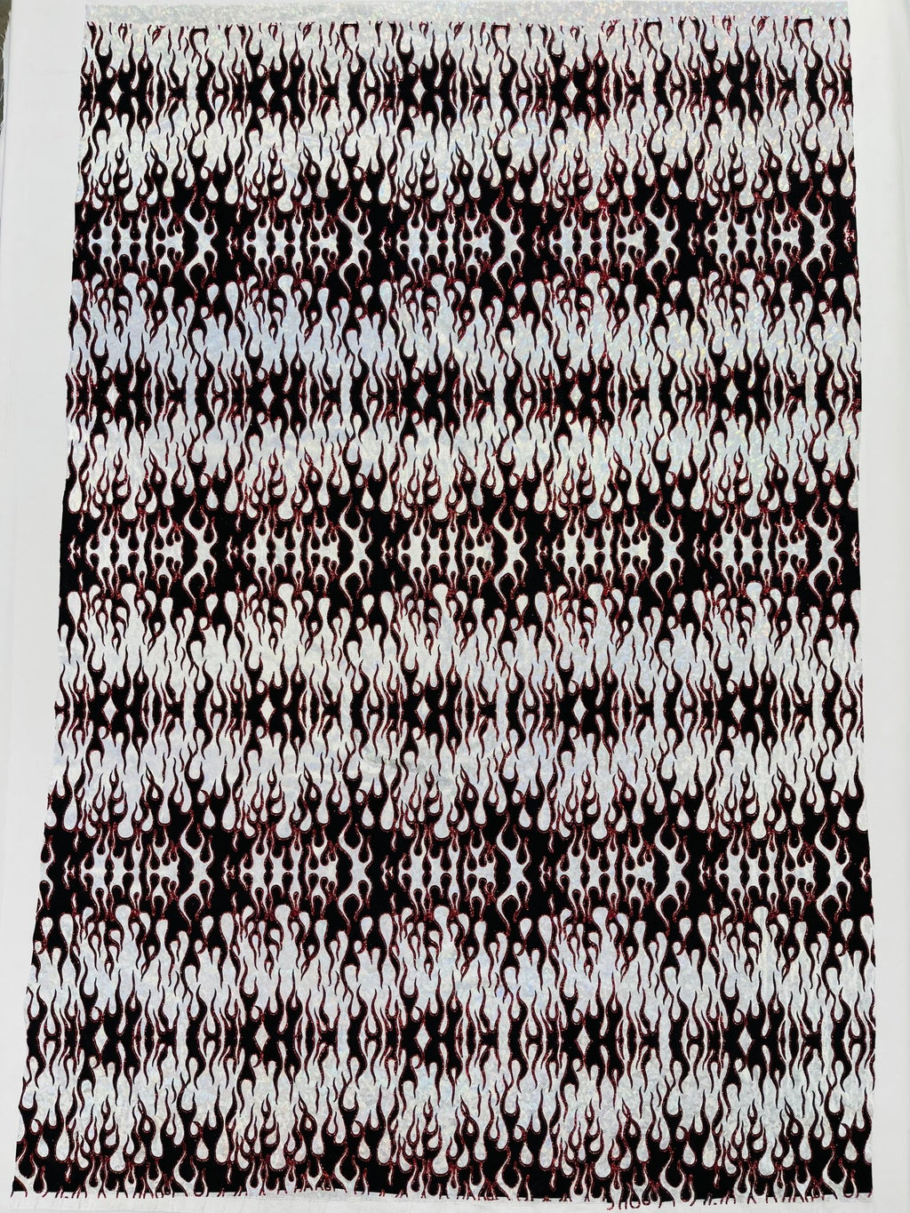 Elevate your fashion game with our holographic flames foil printed spandex fabric! This eye-catching material features a mesmerizing multi-color flames design printed on a stretchy nylon spandex base. With its 4-way stretch capabilities, this 60" wide fabric moves with you, ensuring a comfortable and flattering fit. Perfect for creating bold statement pieces like leggings, bodysuits, or swimwear, this vibrant fabric is sure to turn heads. Unleash your creativity and craft dazzling garments that sizzle with style.