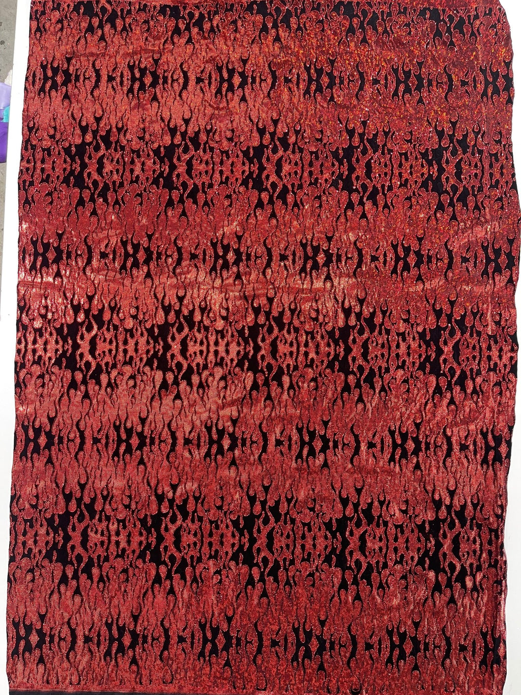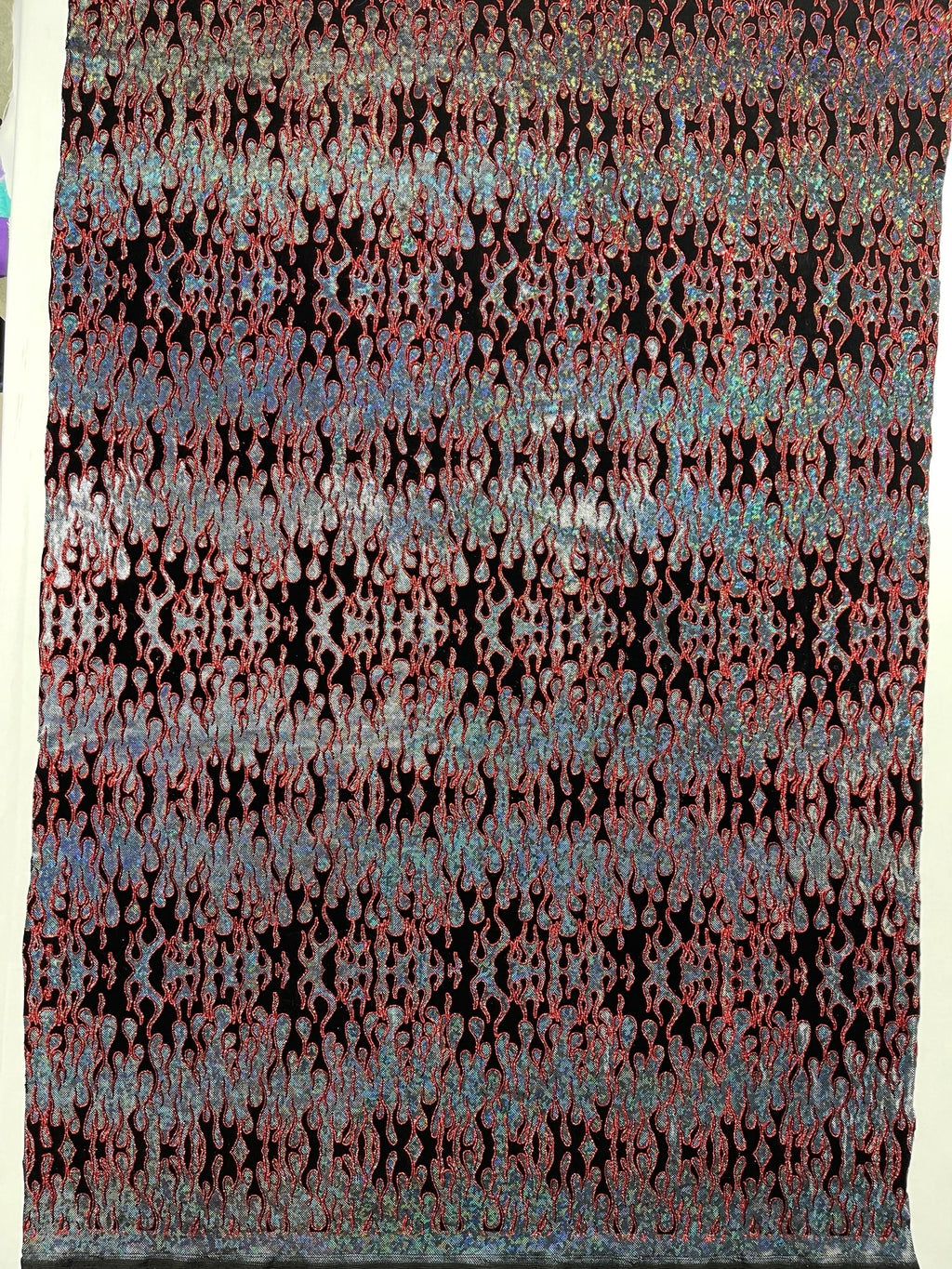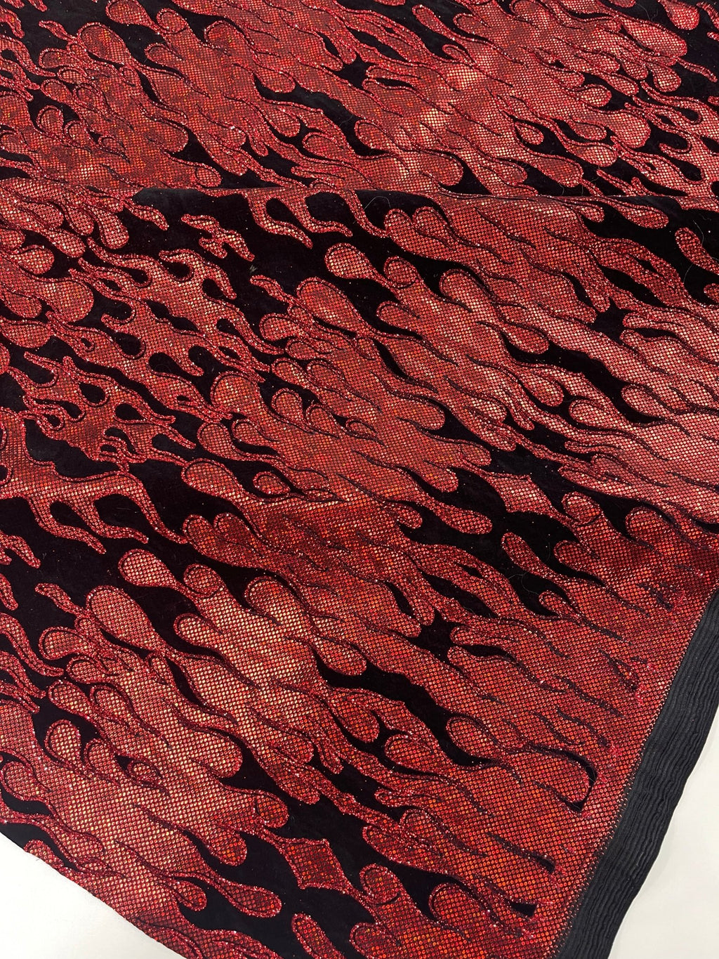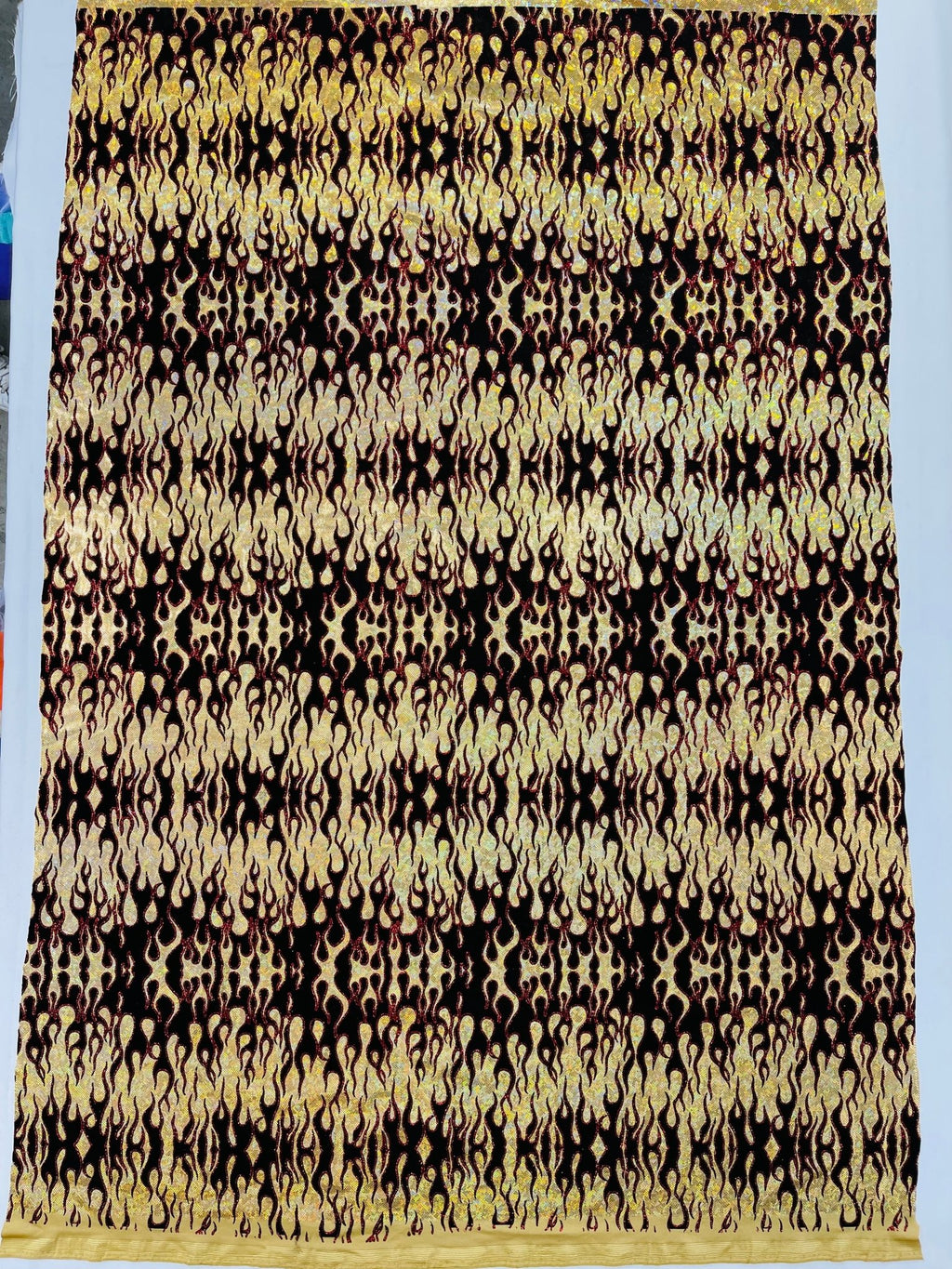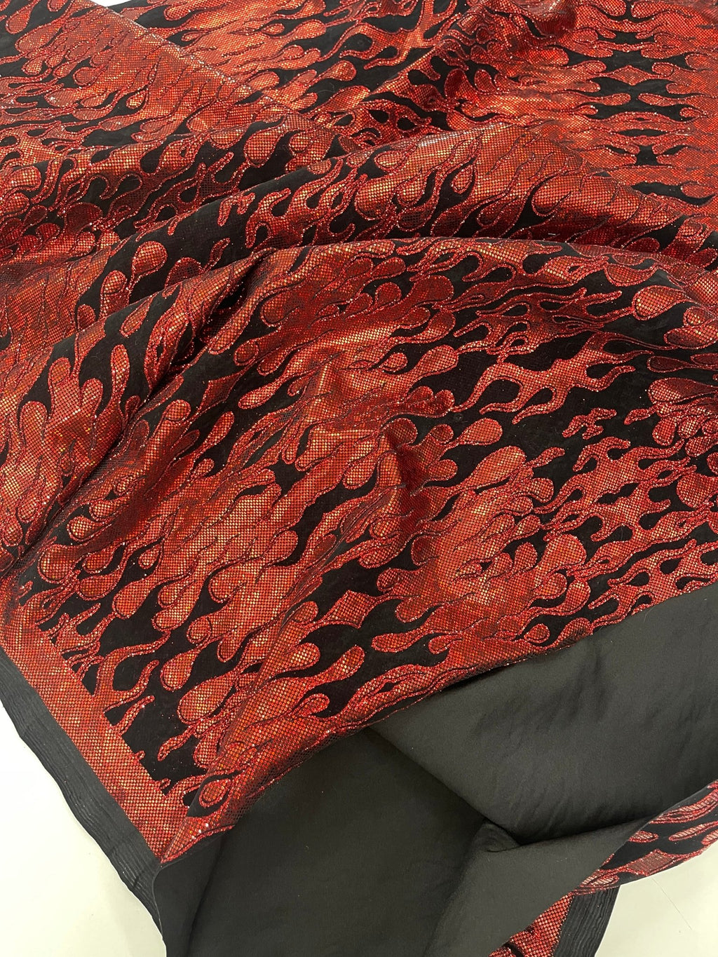 Elevate your fashion game with our holographic flames foil printed spandex fabric! This eye-catching material features a mesmerizing multi-color flames design printed on a stretchy nylon spandex base. With its 4-way stretch capabilities, this 60" wide fabric moves with you, ensuring a comfortable and flattering fit. Perfect for creating bold statement pieces like leggings, bodysuits, or swimwear, this vibrant fabric is sure to turn heads. Unleash your creativity and craft dazzling garments that sizzle with style.