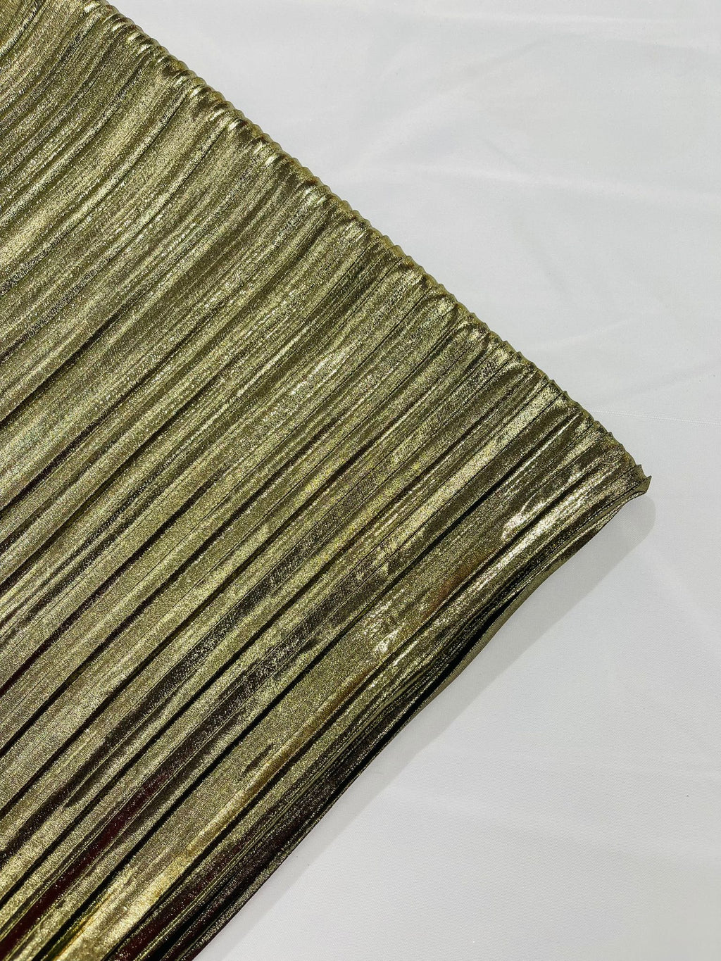 Unleash your inner fashionista with our Titanium Pleated Polyester Fabric! This stunning fabric is a game changer for all your couture lovers out there. Made of exquisite foil covered pleated polyester, it is designed to stretch in the direction of the folds, making it incredibly versatile and perfect for creating iconic statement pieces. Sleek, elegant and absolutely captivating, our Titanium Pleated Polyester Fabric feels luxurious to the touch and exudes pure sophistication. The high-quality material ensures it drapes beautifully, giving your designs a flowy and ethereal vibe. Whether you want to create a chic gown or a show-stopping top, this fabric is guaranteed to elevate your designs to the next level. It's perfect for adding texture and movement to your creations and will undoubtedly turn heads everywhere you go. Get ready to unleash your creativity and make a statement with our Titanium Pleated Polyester Fabric. It's time to let your imagination run wild and create something truly extraordinary
