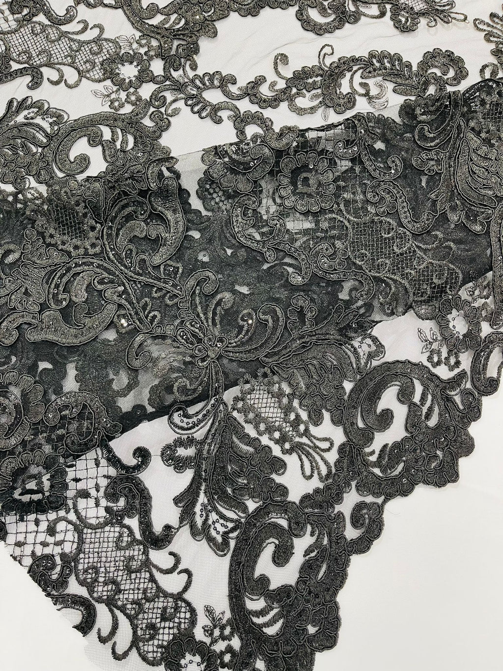 These corded flowers are embroider with sequins on a mesh lace fabric giving off a sophisticated and elegant look . The lace has a double scallops on the width. This lace can be used for dresses, tablecloths, nightgowns, prom gowns, bridal gowns, wedding gowns, runners, Vegas shows, pillows, decoration, and much more.