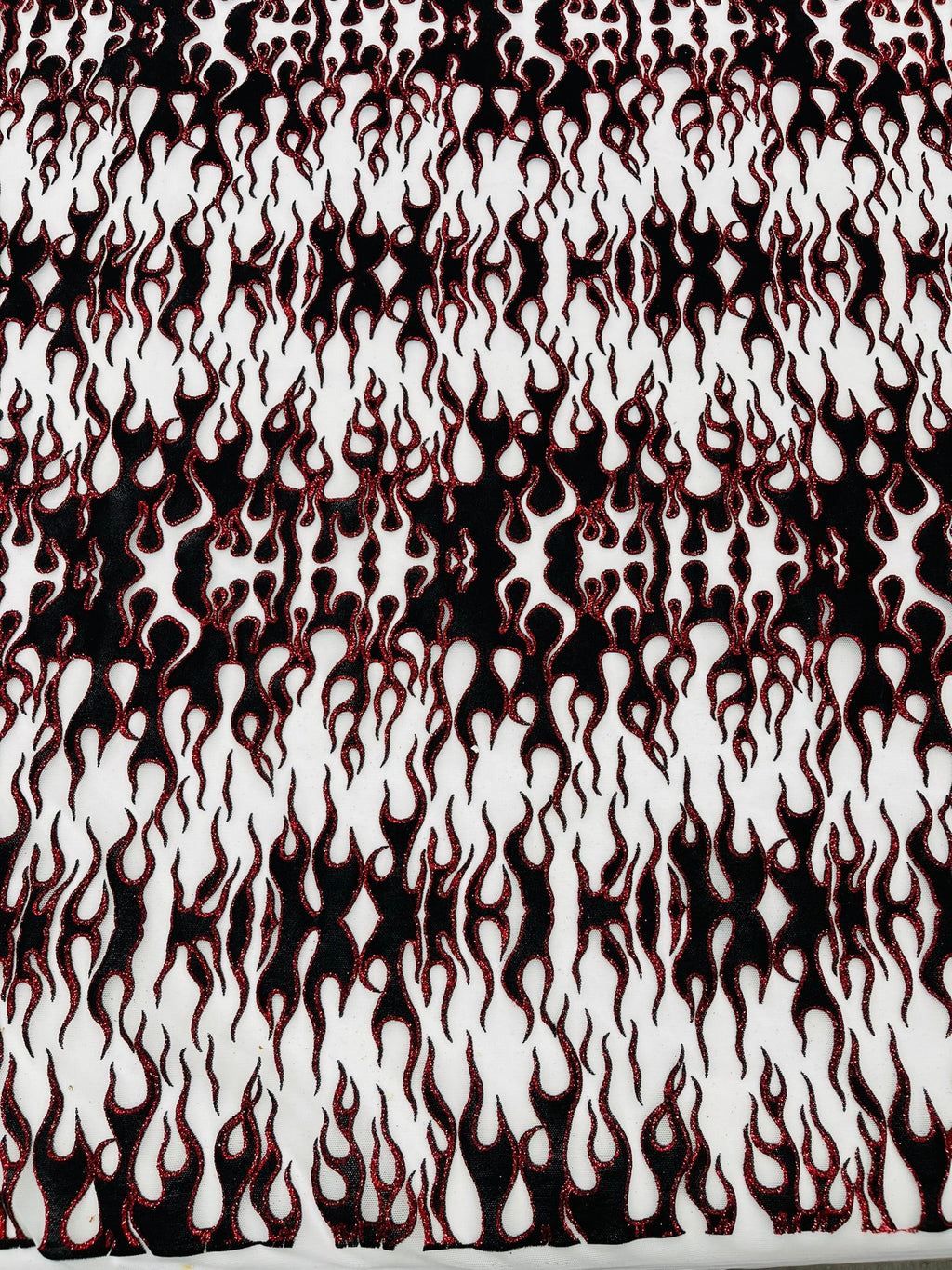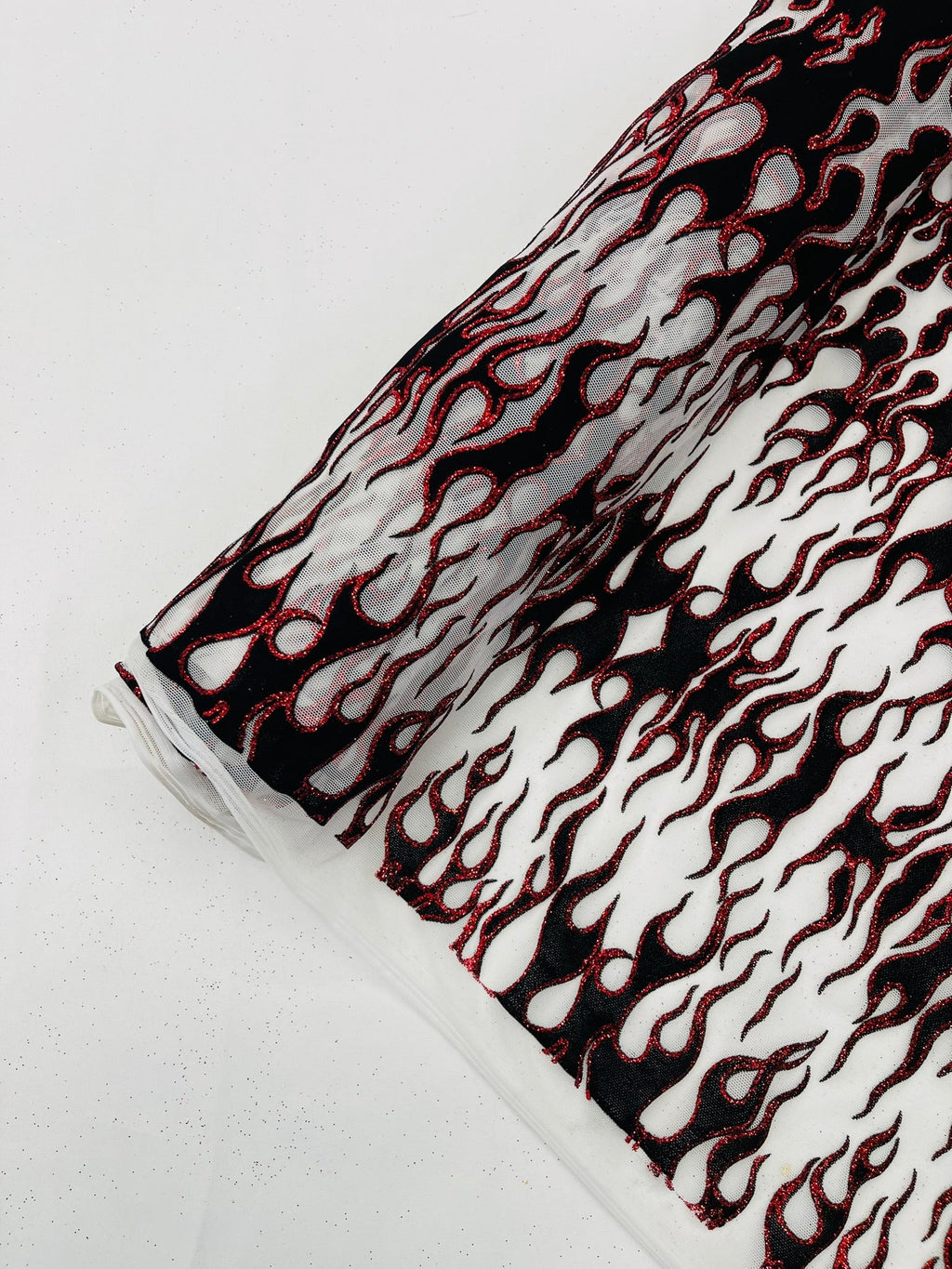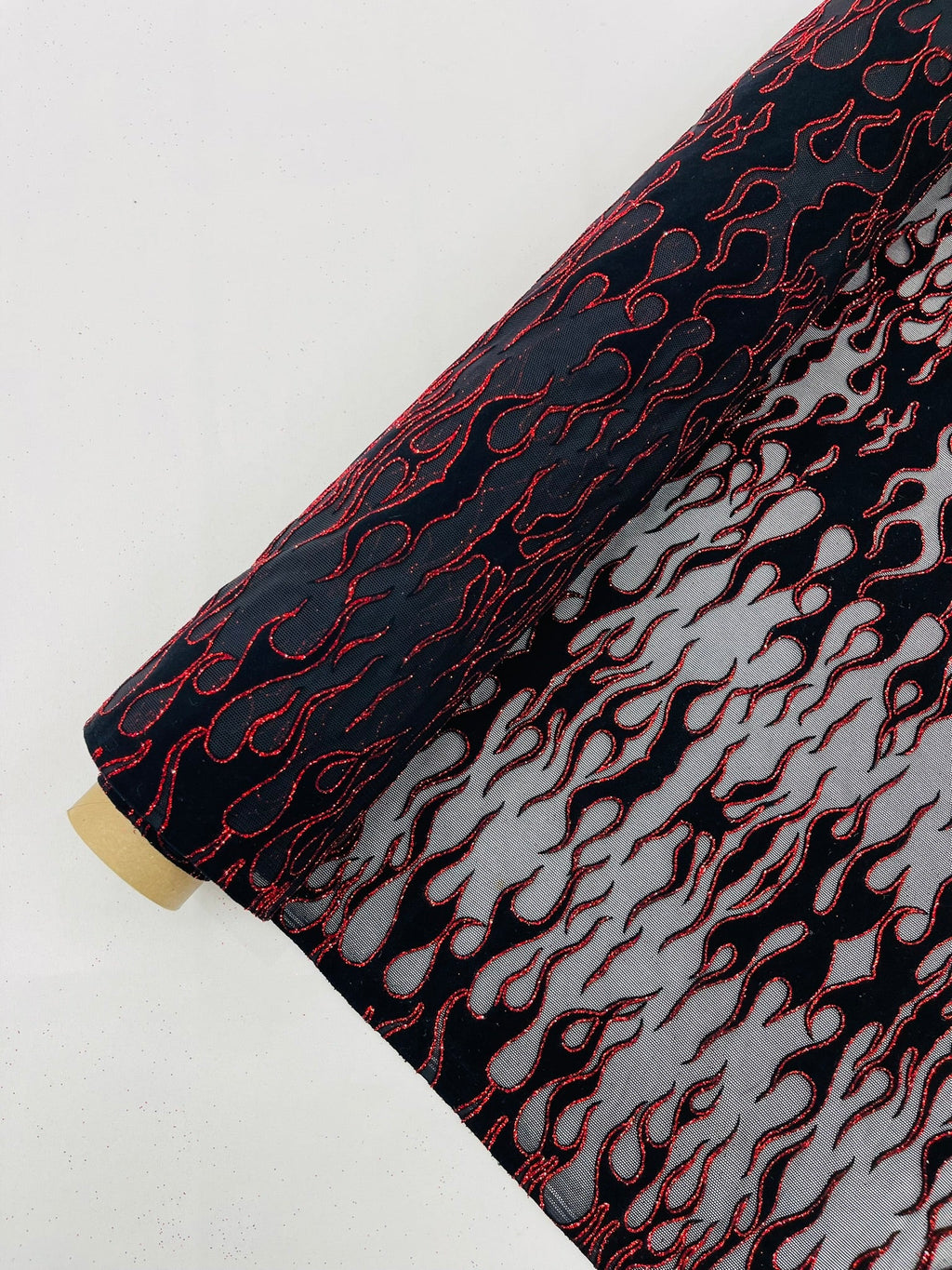Transform your creative projects with this striking Power Mesh fabric featuring bold black flocking flames and eye-catching red glitter accents. At a generous 60 inches wide, this fabric offers ample material for automotive interiors, custom upholstery, or distinctive fashion pieces. The mesh base provides excellent breathability while the flocked flame pattern adds depth and texture. Perfect for hot rod enthusiasts looking to add that extra flair to their vehicle's interior, or designers seeking a unique material for statement pieces. The combination of black flames and sparkling red glitter creates a dynamic, head-turning effect that captures the essence of custom car culture. This versatile fabric can be used for seats, panels, accent pieces, or anywhere you want to make a bold statement. The durable construction ensures your creation maintains its striking appearance.
