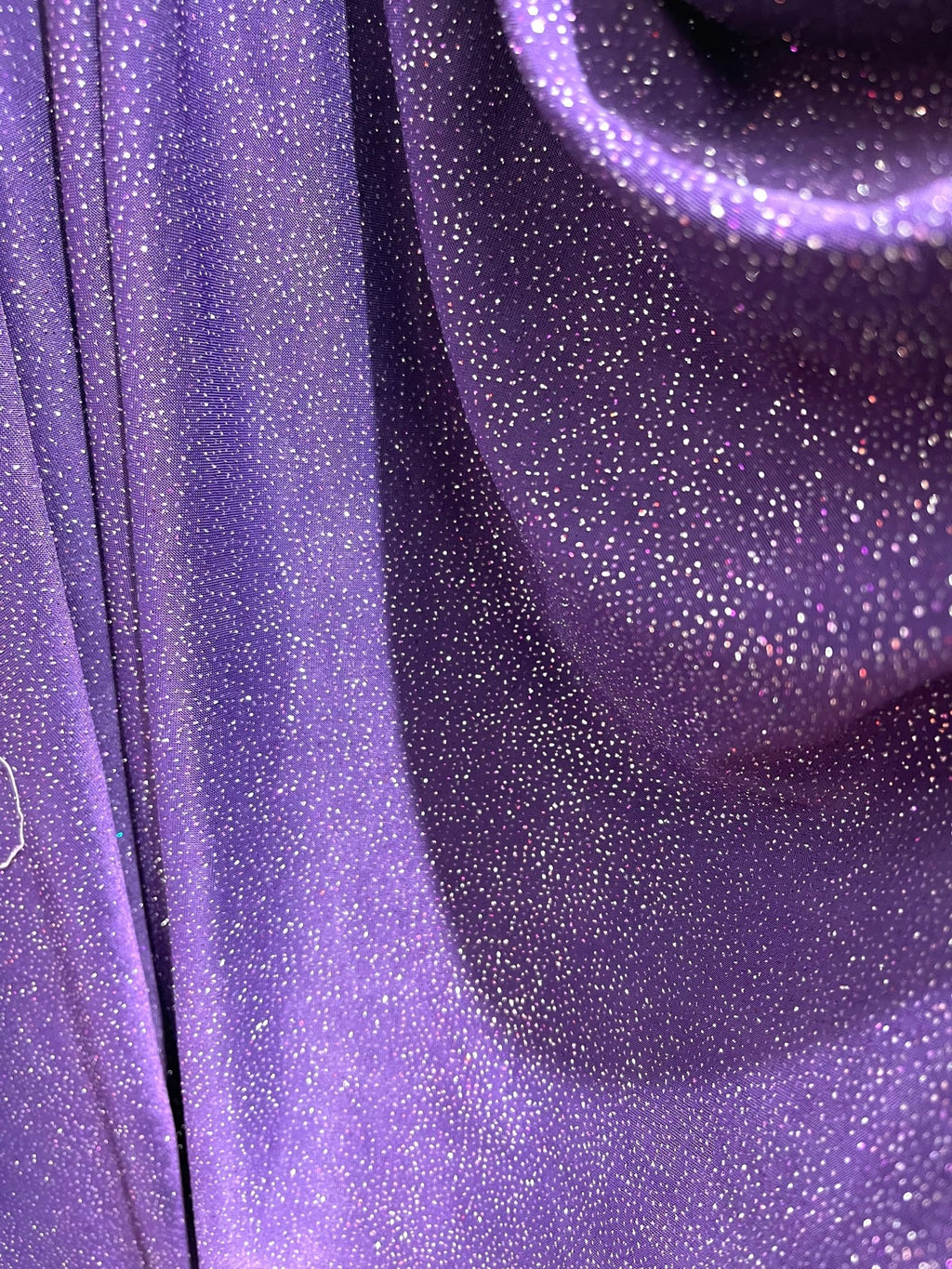 The design has two color tones on the design, the SPANDEX it’s a dark purple and the glitter it’s silver iridescent. When you brush it with your fingers it changes colors. These Stretch SPANDEX can be use for dresses, tablecloths, nightgowns, prom gowns, bridal gowns, wedding gowns.runners, Vegas shows,pillows, decoration and much more. If you purchase more than one yard we will send you the fabric in one piece. 100% polyester