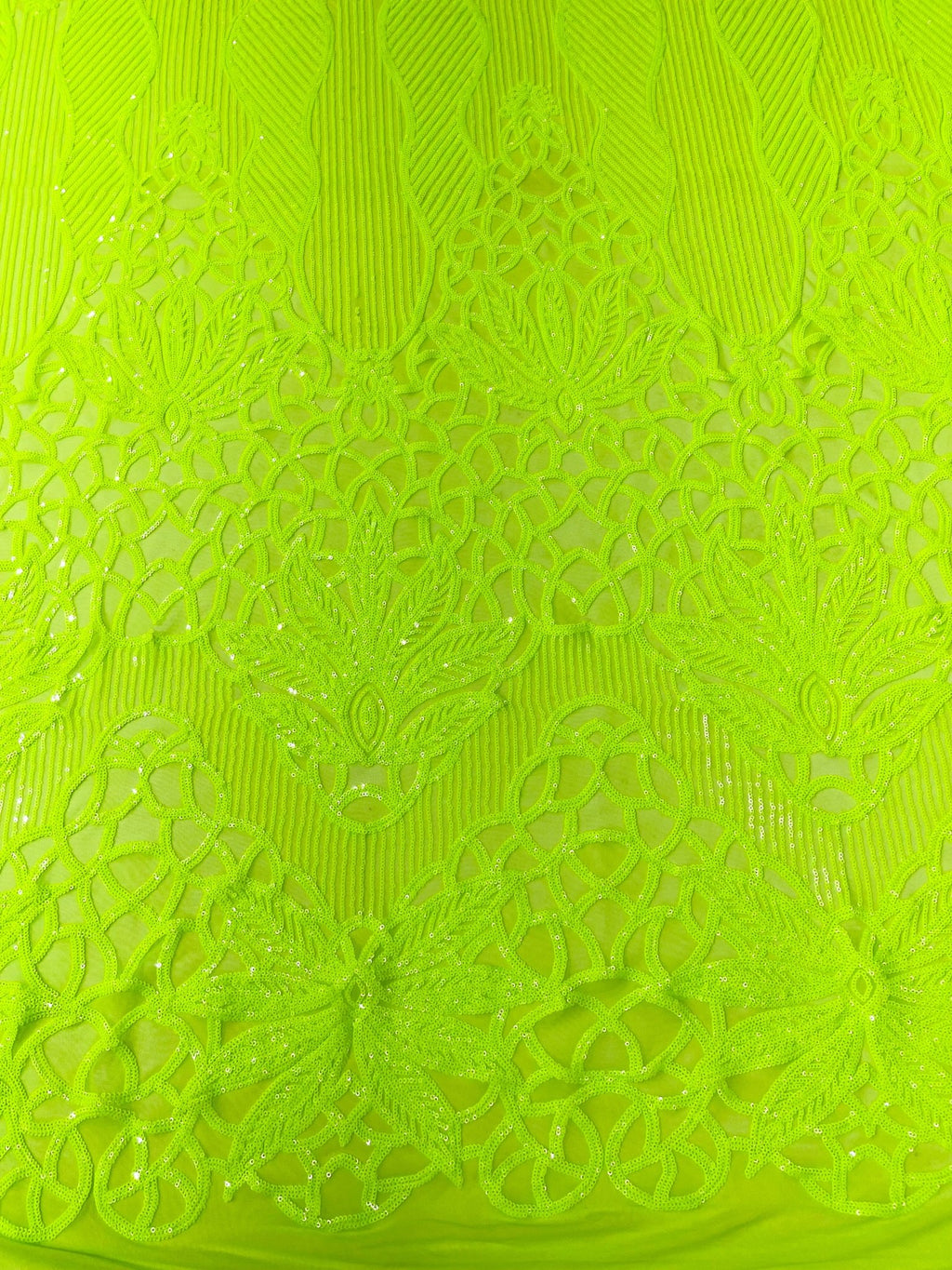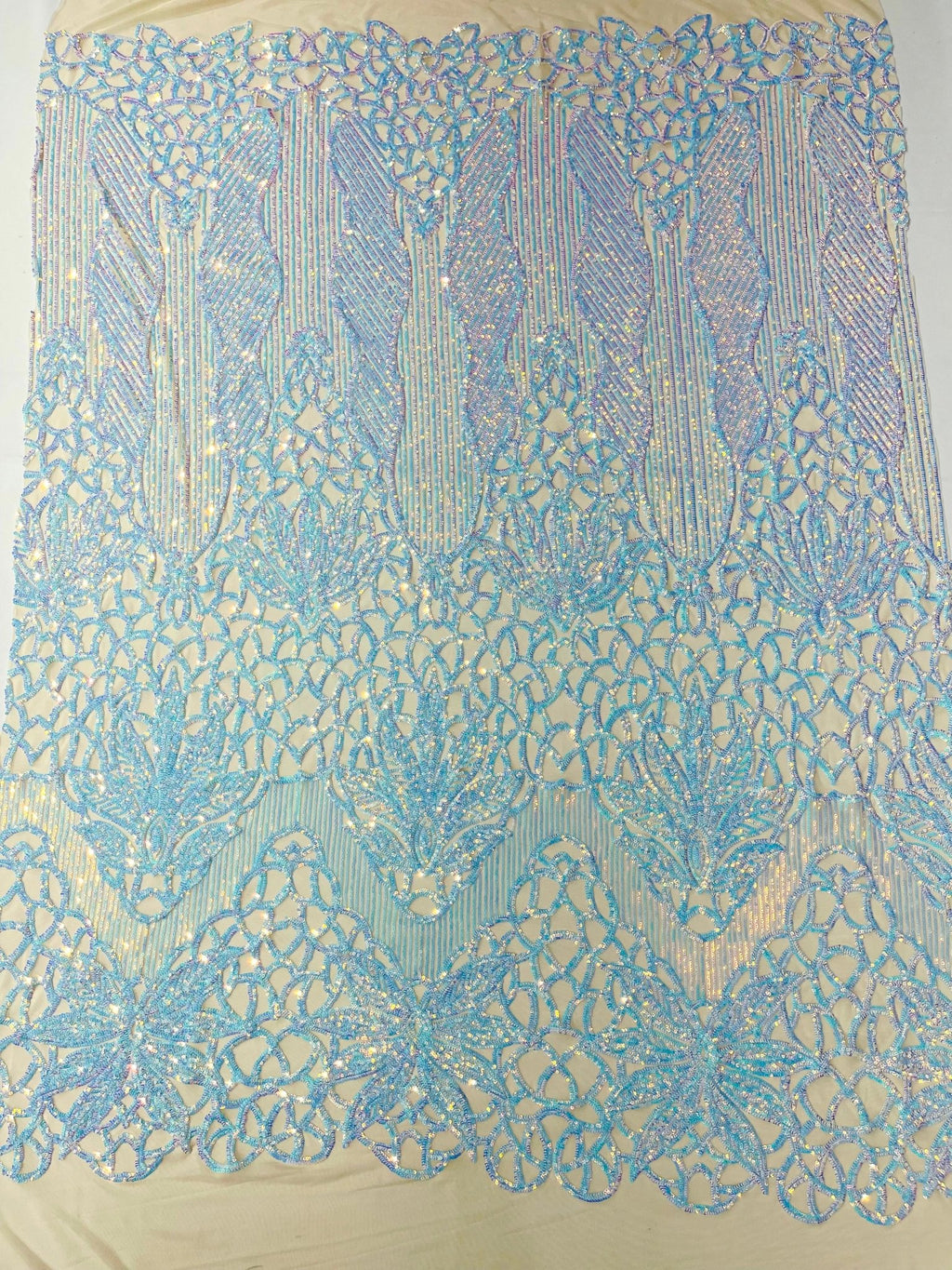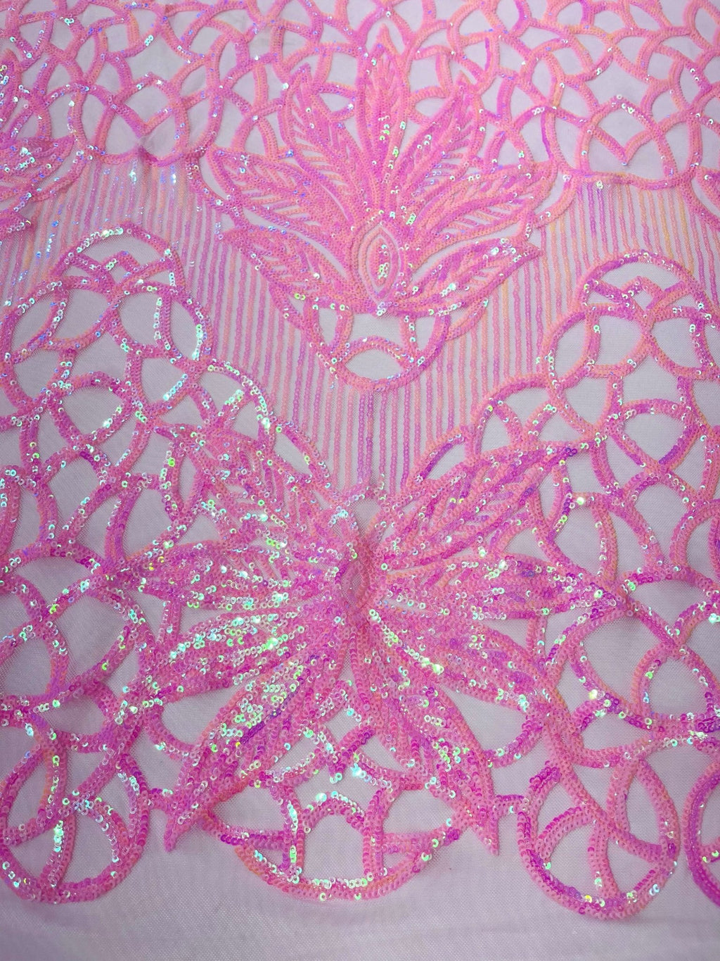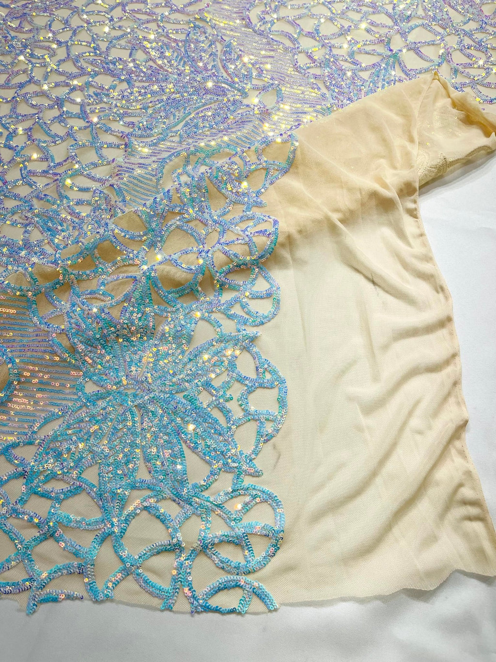 This Floral Damask design is embroidered with iridescent Sequins on a 4 Way Stretch mesh fabric. The iridescent Sequins has especial and extraordinary design on the Mesh . It is super elegant and classy, The royalty design embroider with iridescent Sequins on a mesh can be use for dresses, tablecloths, night gowns, Skirts, prom dresses, wedding dresses, runners for tables,decoration and much more.