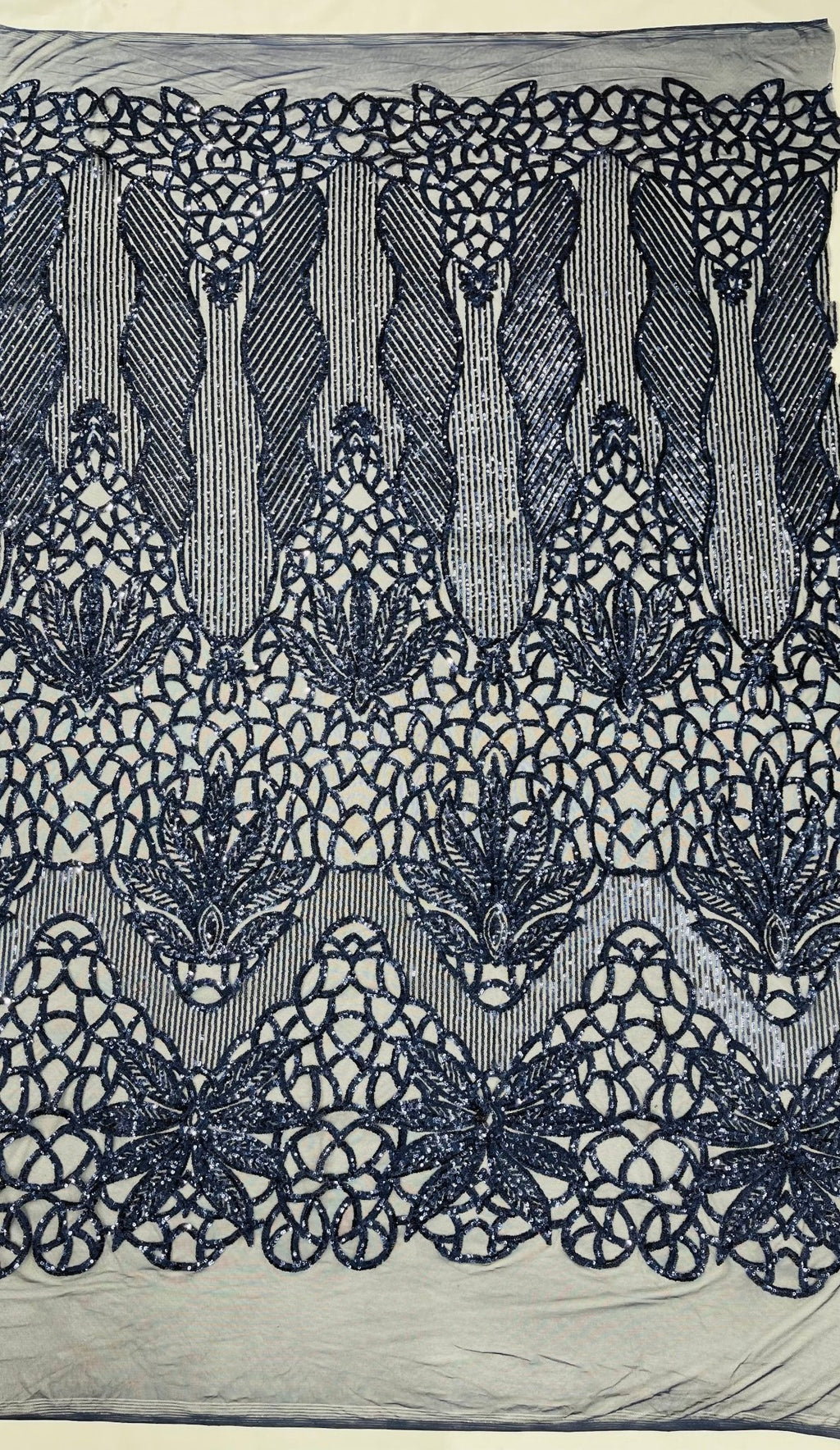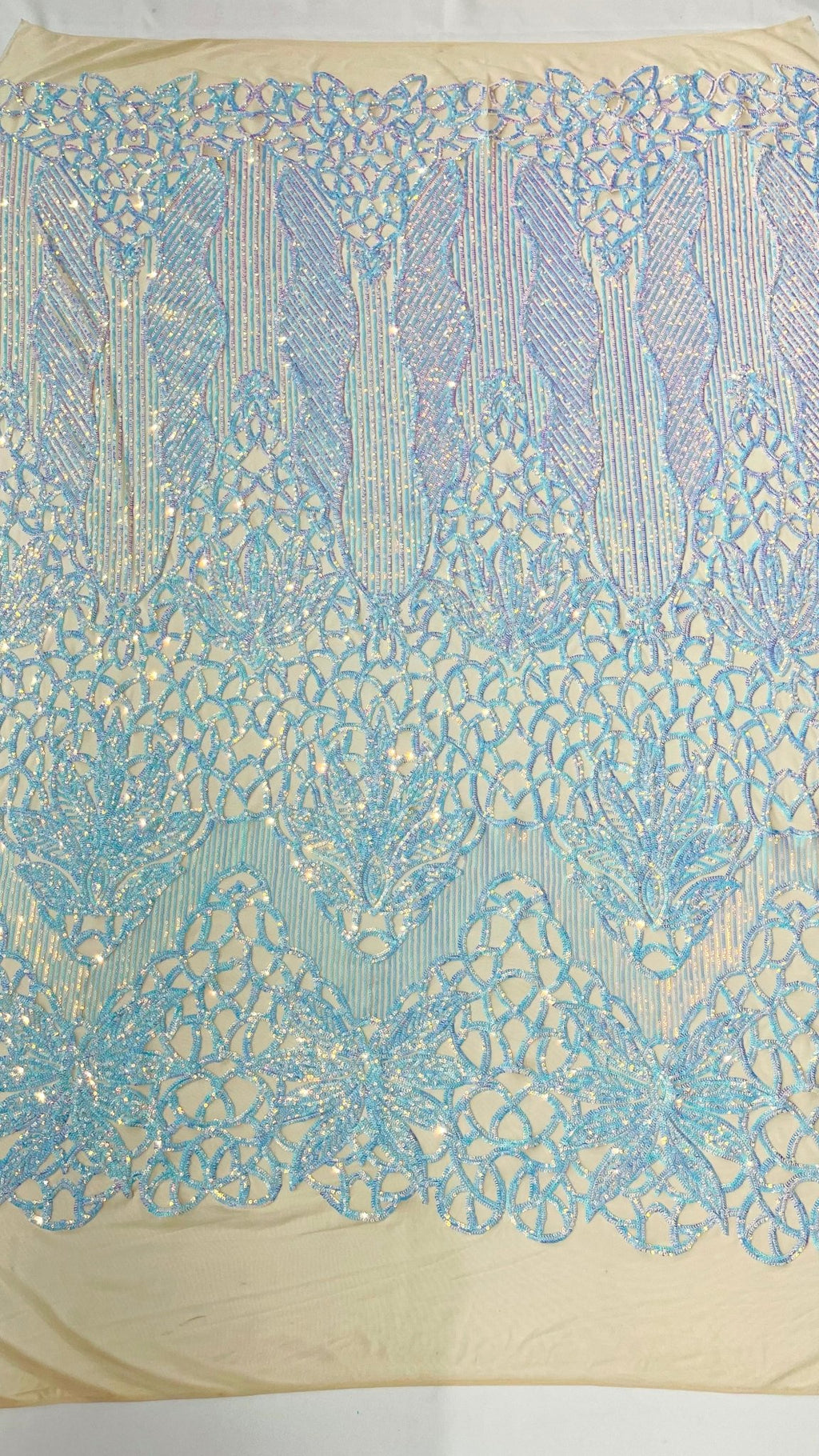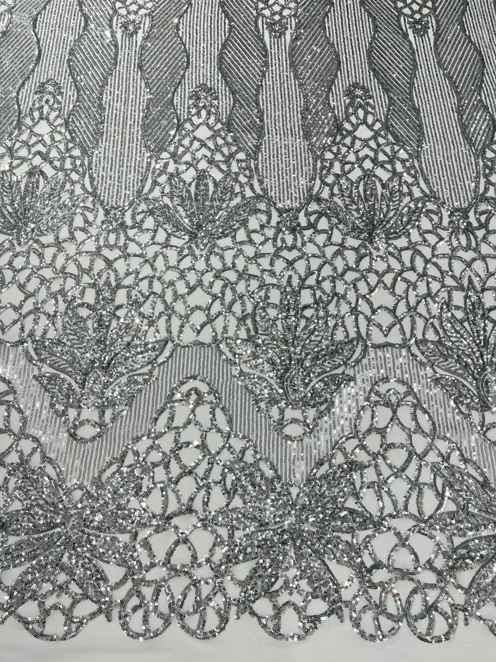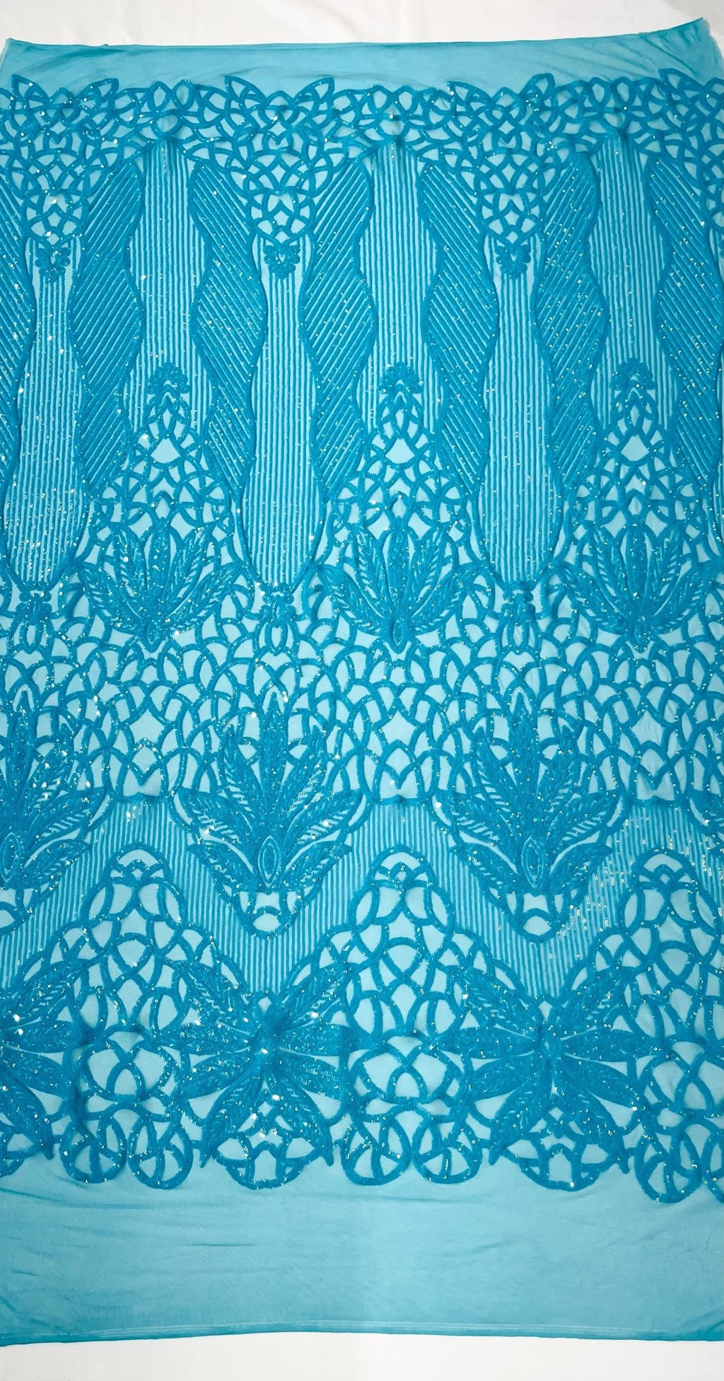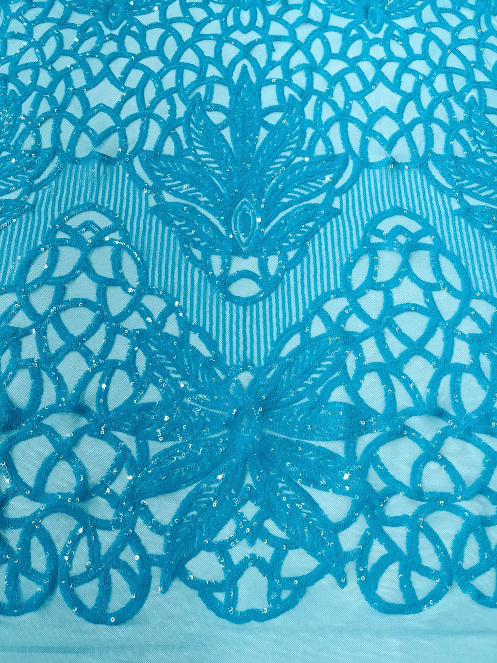 This Floral Damask design is embroidered with iridescent Sequins on a 4 Way Stretch mesh fabric. The iridescent Sequins has especial and extraordinary design on the Mesh . It is super elegant and classy, The royalty design embroider with iridescent Sequins on a mesh can be use for dresses, tablecloths, night gowns, Skirts, prom dresses, wedding dresses, runners for tables,decoration and much more.