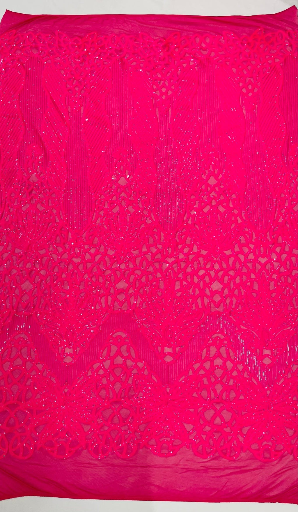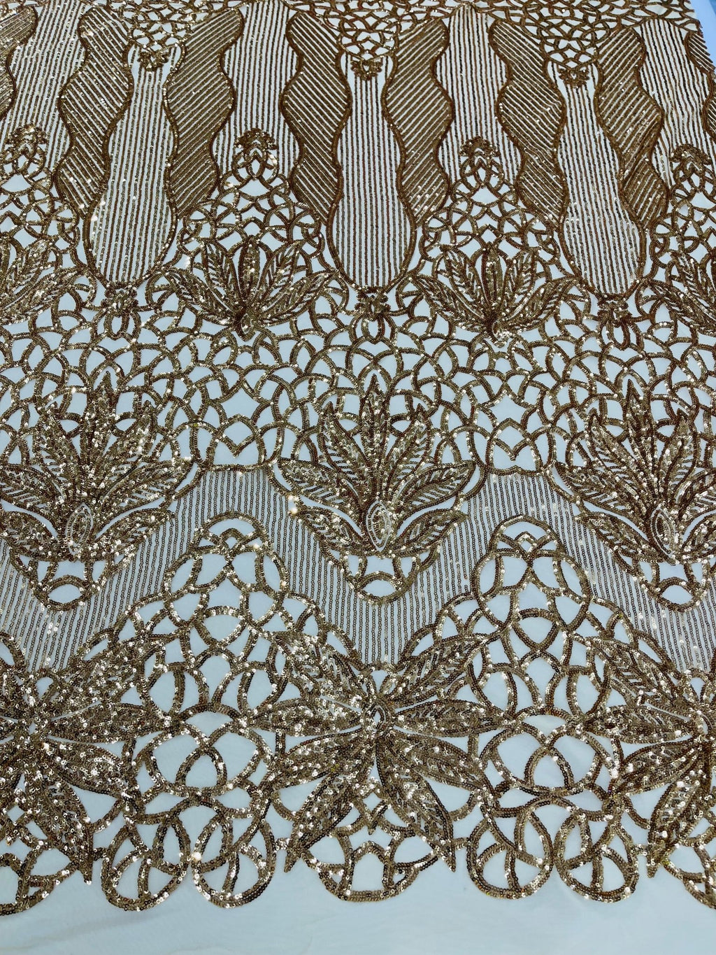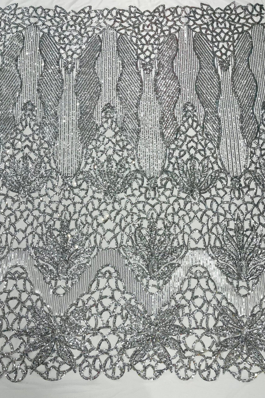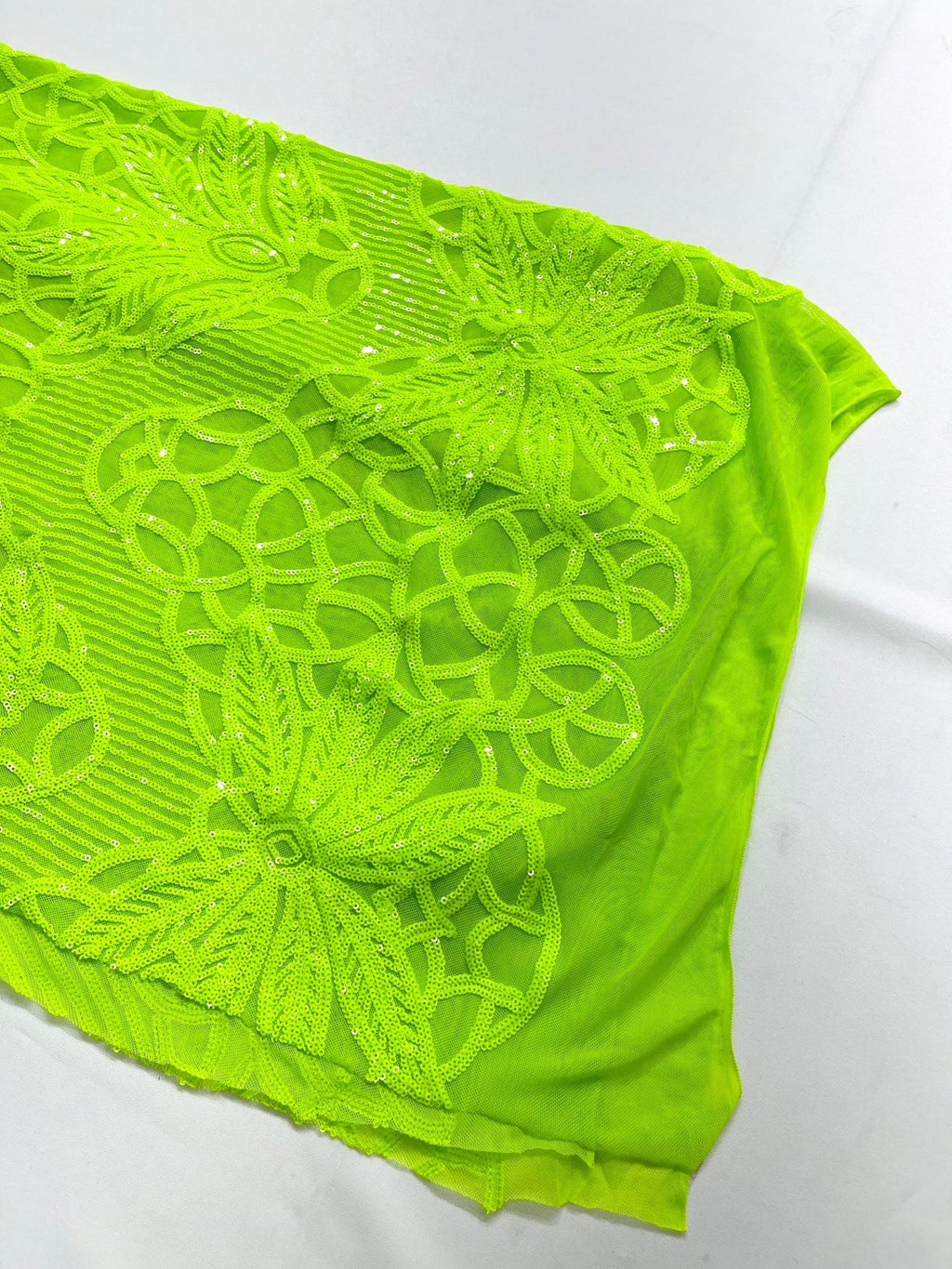This Floral Damask design is embroidered with iridescent Sequins on a 4 Way Stretch mesh fabric. The iridescent Sequins has especial and extraordinary design on the Mesh . It is super elegant and classy, The royalty design embroider with iridescent Sequins on a mesh can be use for dresses, tablecloths, night gowns, Skirts, prom dresses, wedding dresses, runners for tables,decoration and much more.
